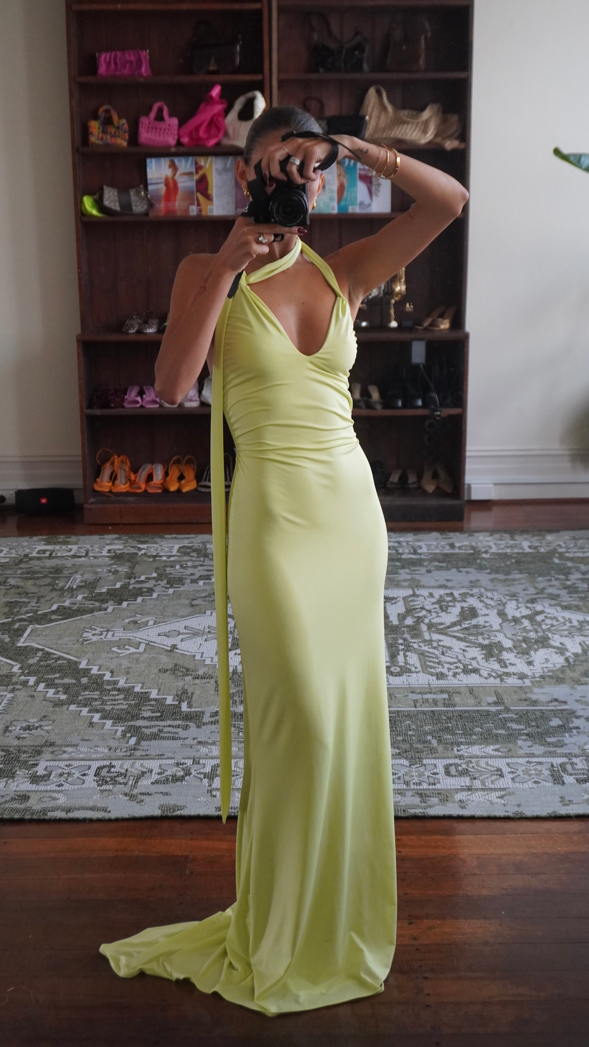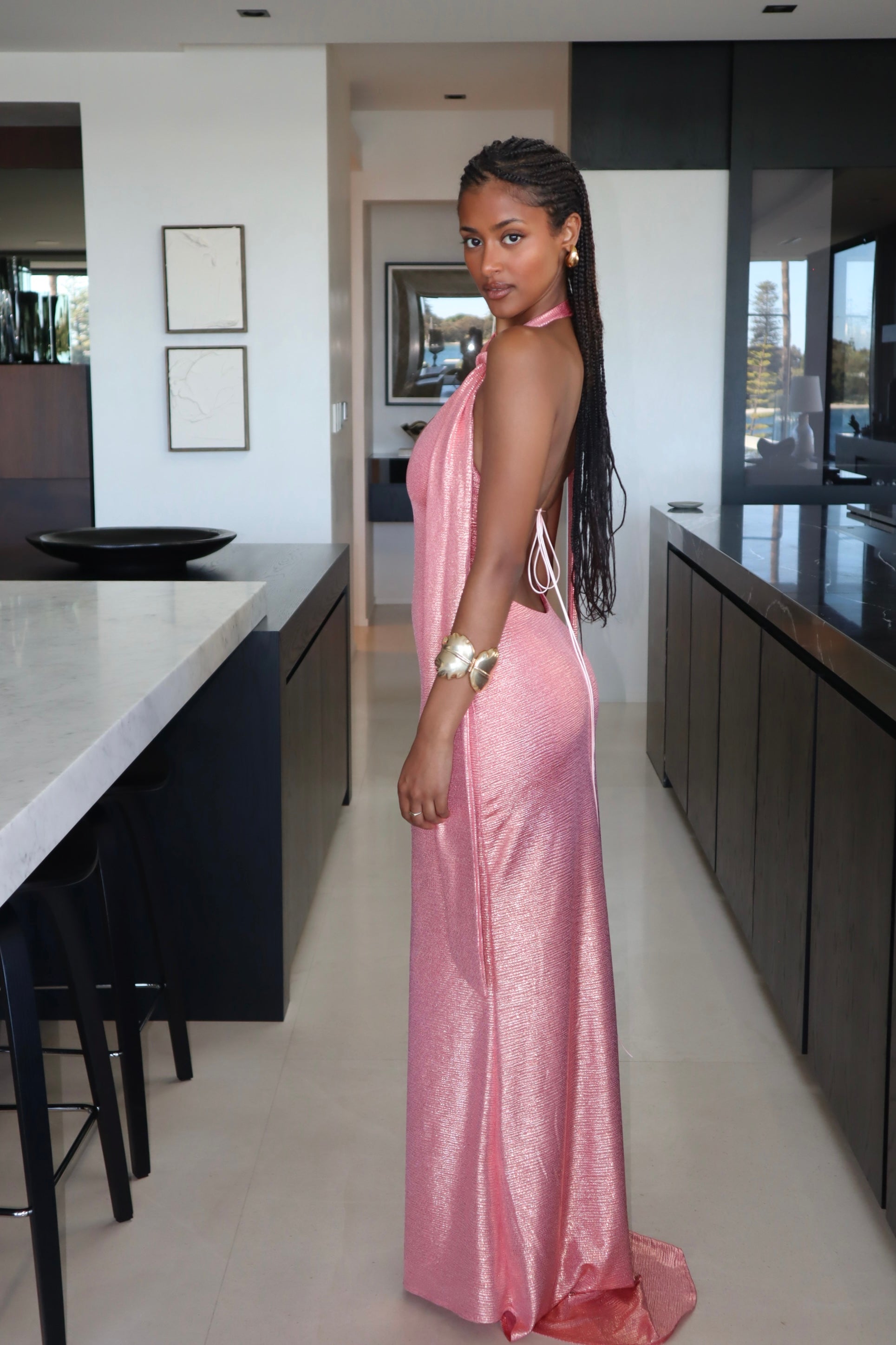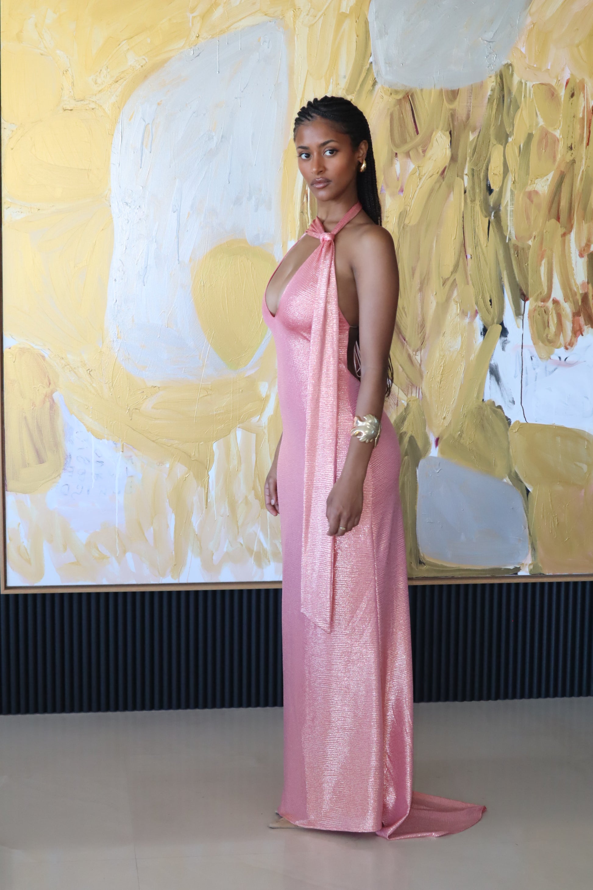 Crafted to perfection, the style boasts a striking formal silhouette, featuring a plunging neckline and low back. Delicate neck ties add a touch of intricacy, while the slender rat tail cords at the back ensure a flattering fit. Designed to embrace the body gracefully, it strikes the perfect balance between form-fitting and comfortable.