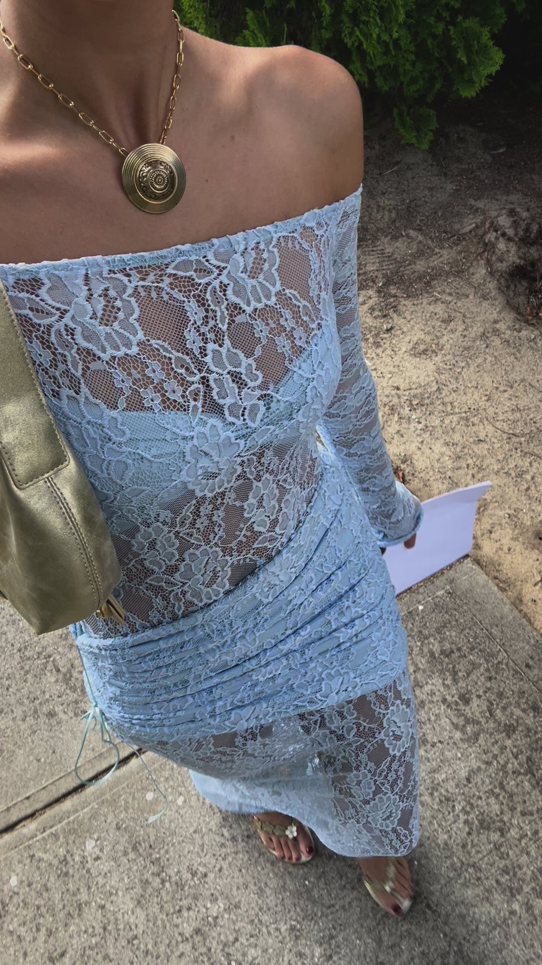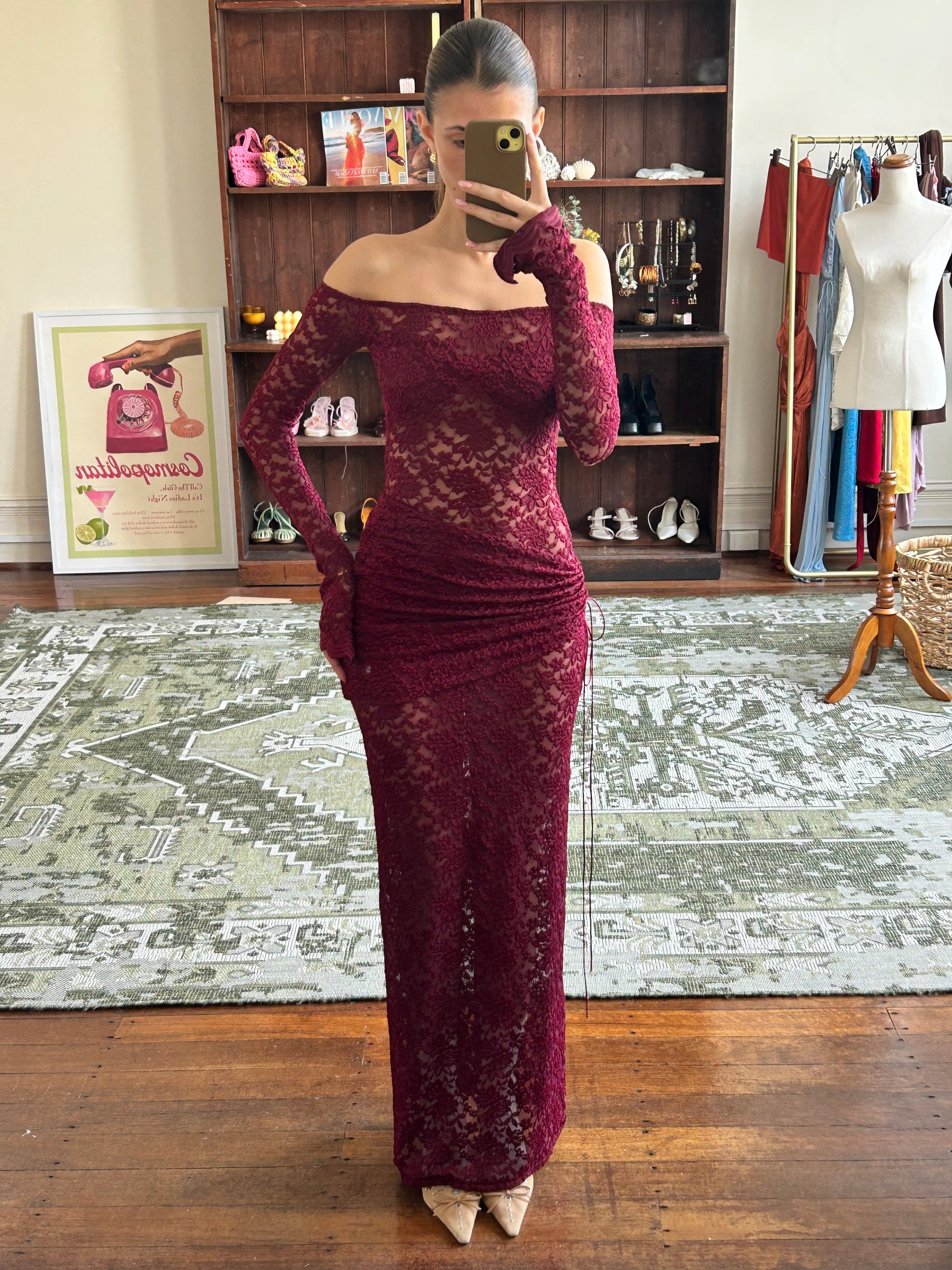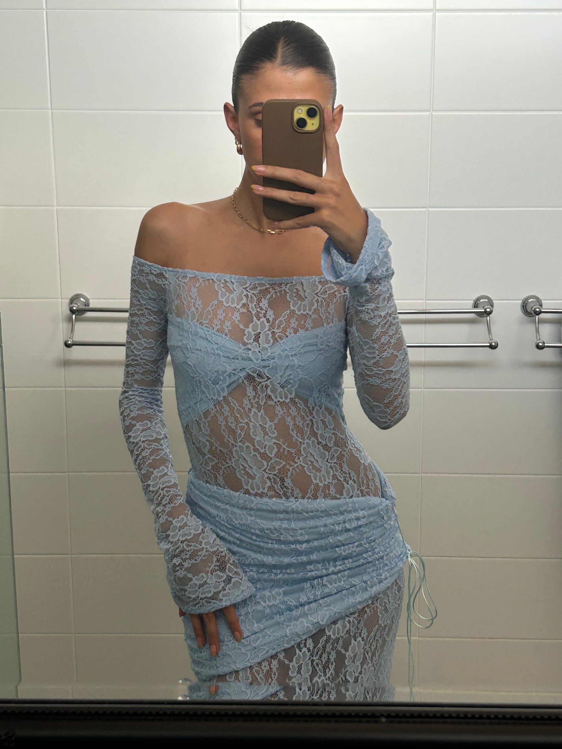 Introducing the CHRISTIANA, the newest addition to our collection. A delicate lace sheer dress, featuring elements strategically placed to elegantly frame the bust and enhance the silhouette. The style has a seperate overskirt which can be worn however you see fit. The style is a perfect hybrid between our CARMINE and MILANO styles. The fully lace backless silhouette adds a touch of chic to the ensemble. While it's a natural choice for cooler months' events, its sheer construction ensures it remains a wardrobe staple across all seasons.