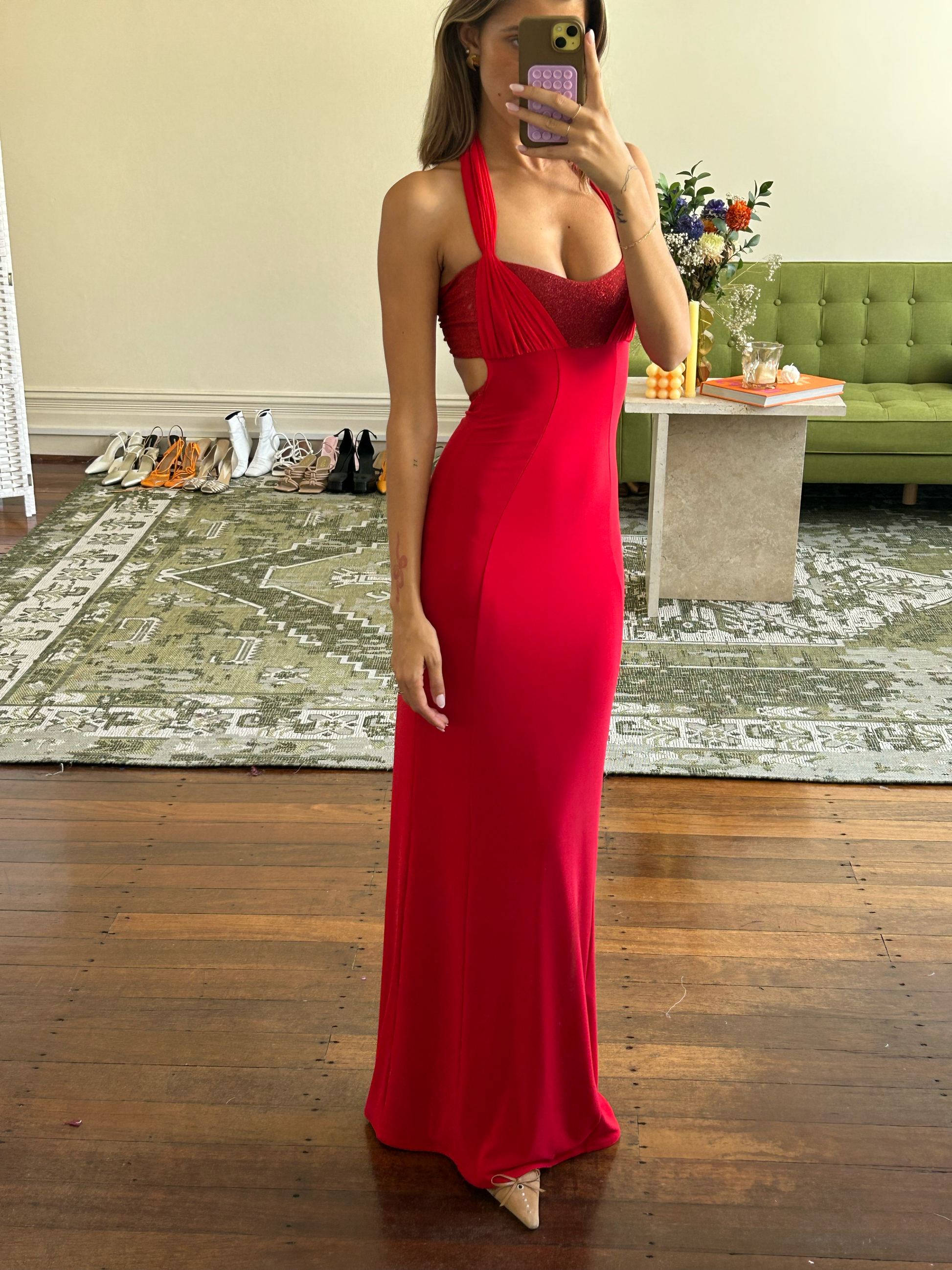 The meticulously crafted bodice features two seam lines strategically placed to create the illusion of a smaller waist, enhancing your silhouette with grace. A play of mesh and glitter introduces a captivating contrast to the overall design, adding a touch of glamour. The adjustable bust element at the back ensures support for all bust sizes, while the modest yet alluring low back completes the perfect balance.