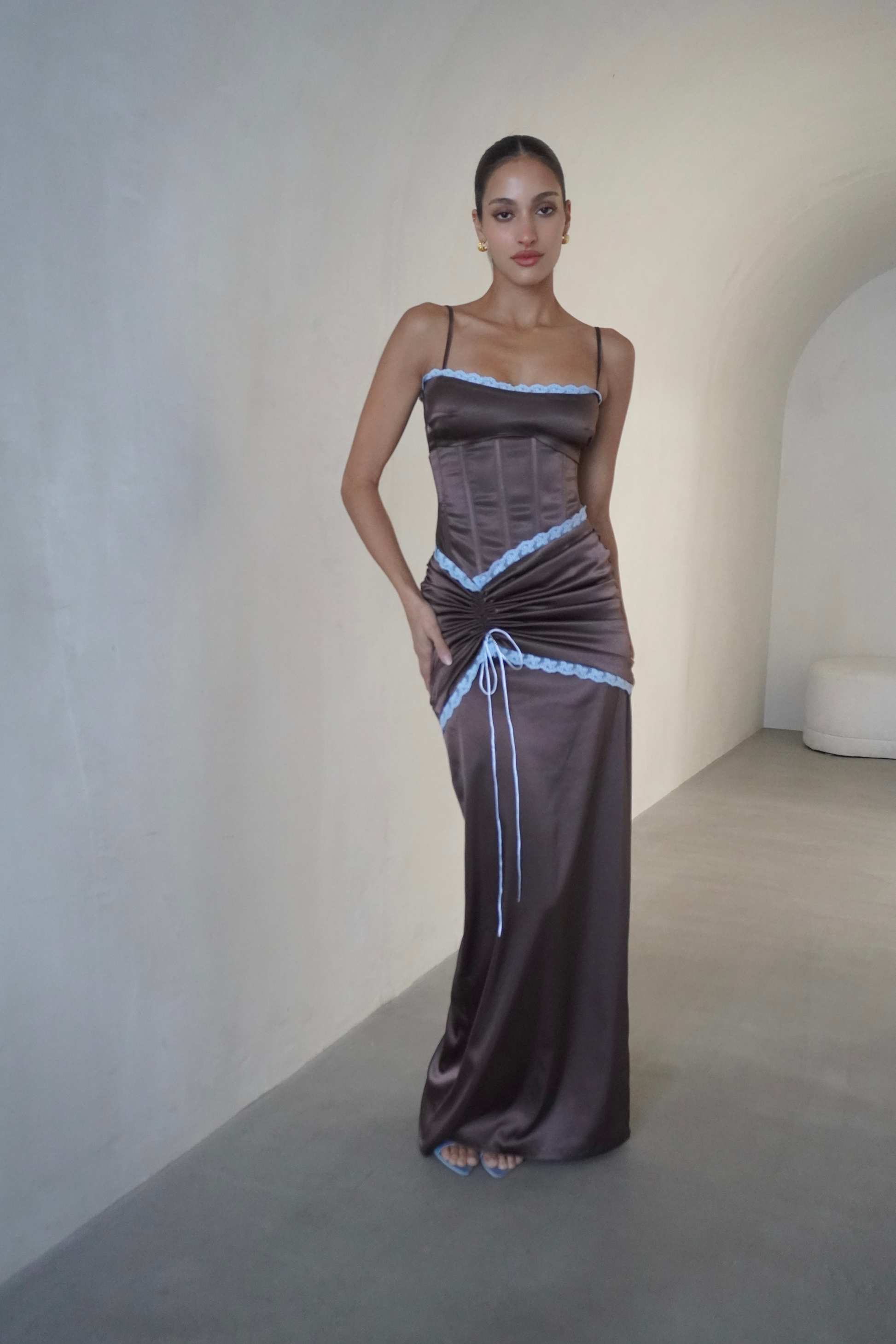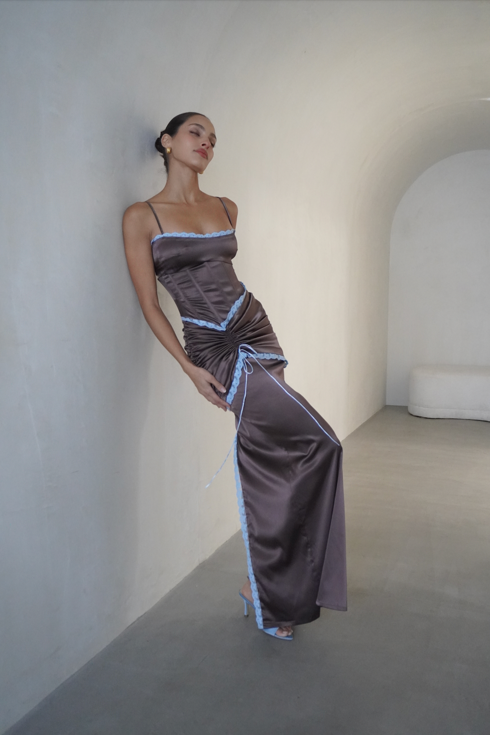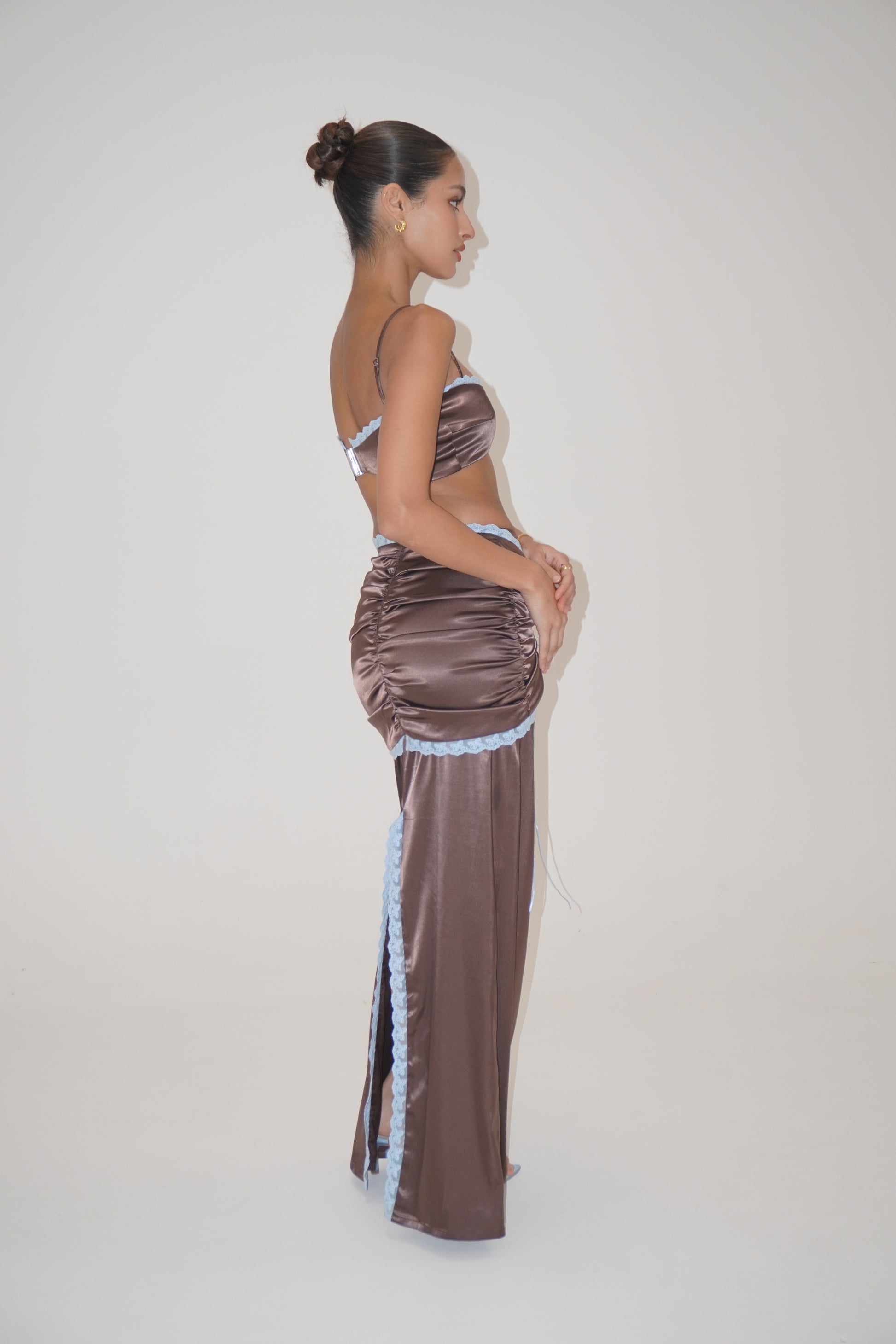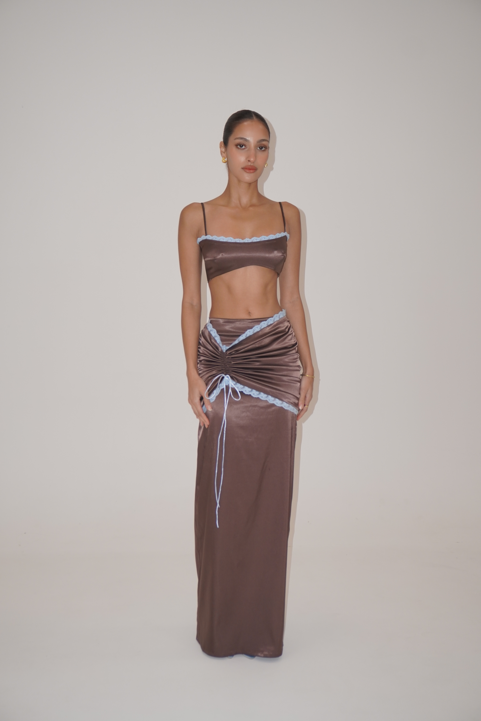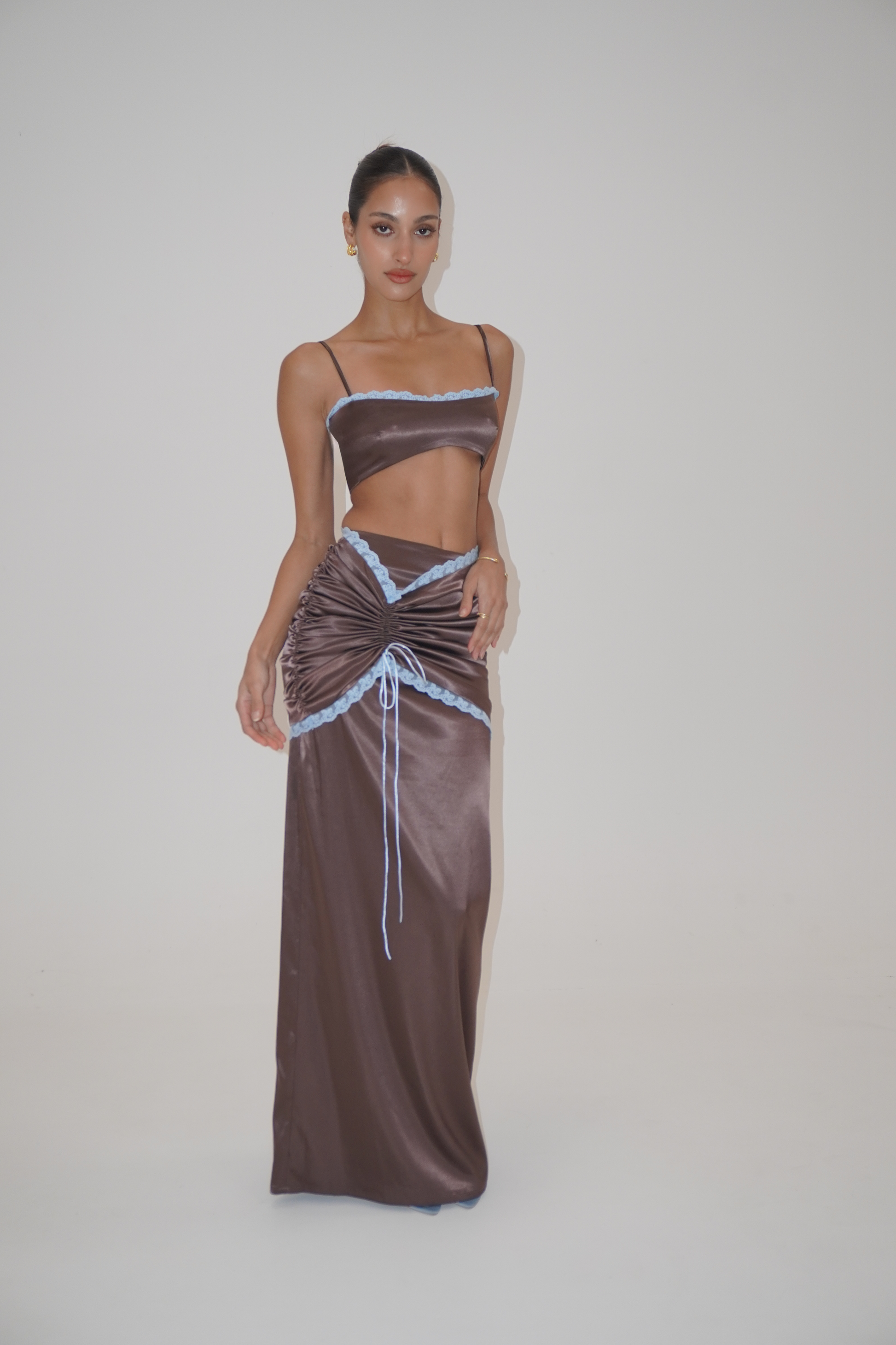 This ensemble features a bralette, an underbust corset, and a maxi skirt. Each piece is designed to be worn individually or together, offering maximum versatility: