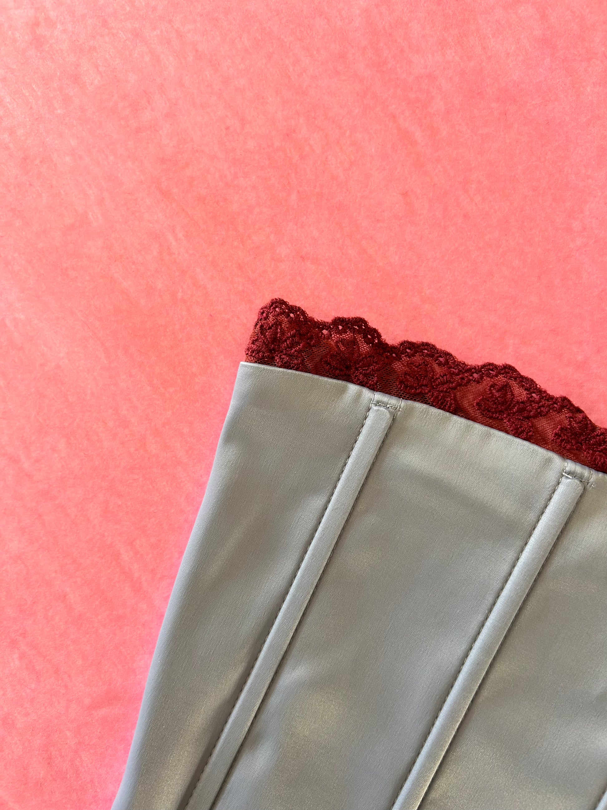 Crafted from luxurious satin with a subtle stretch, the Mira Set offers both elegance and comfort for all-day wear. The structured corset cinches the waist beautifully, creating a sculpted silhouette, while delicate wine-colored trim outlines the entire piece, adding a refined touch of detail. A sleek silver zipper at the back ensures a secure and seamless fit.