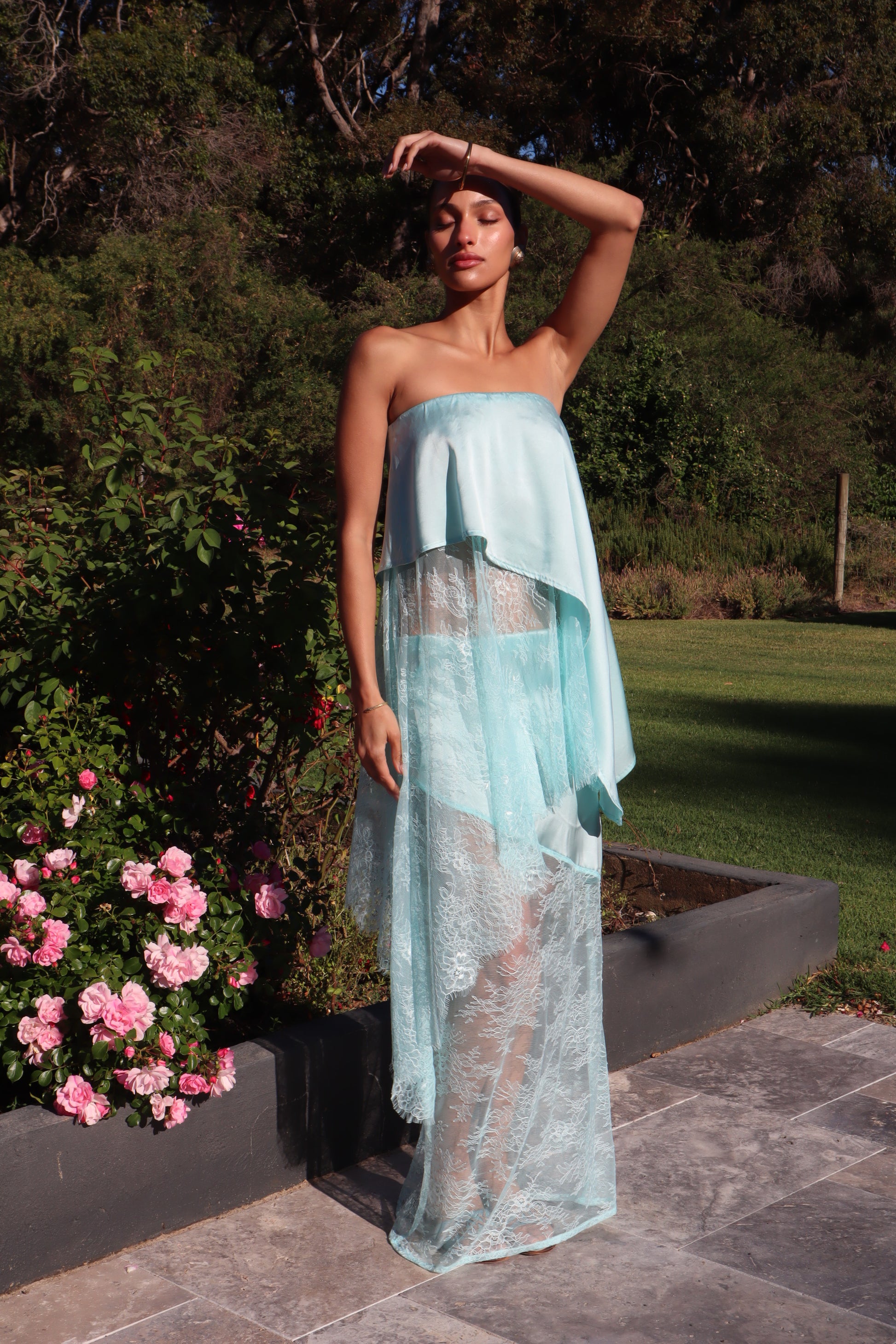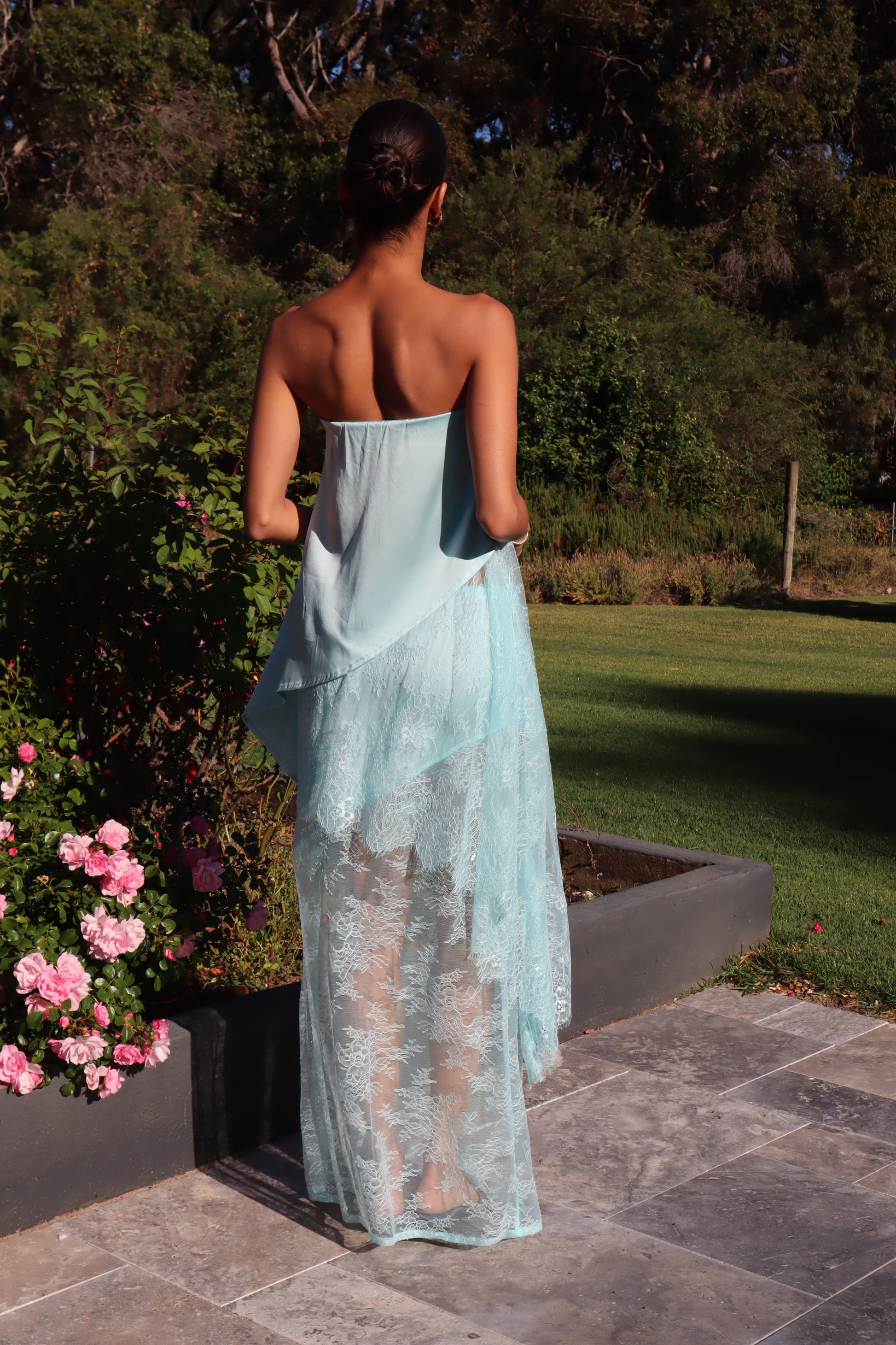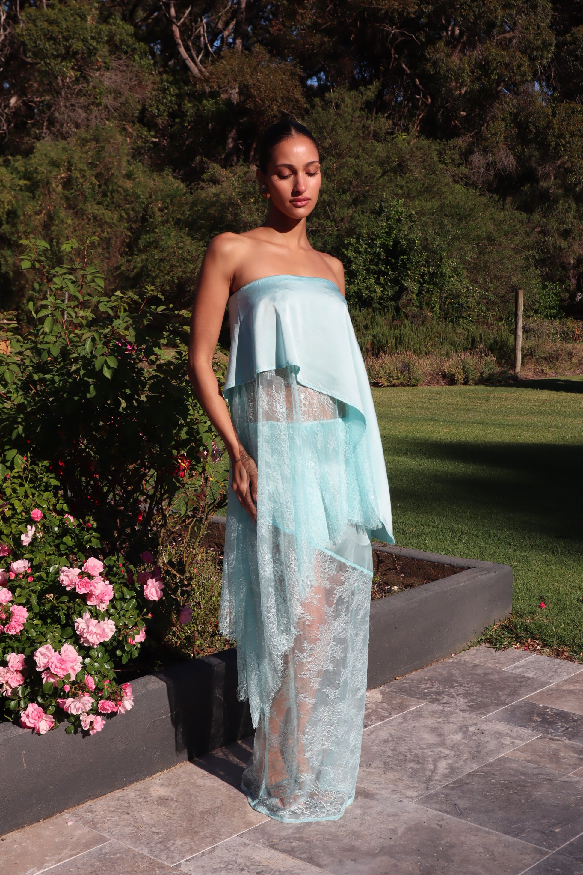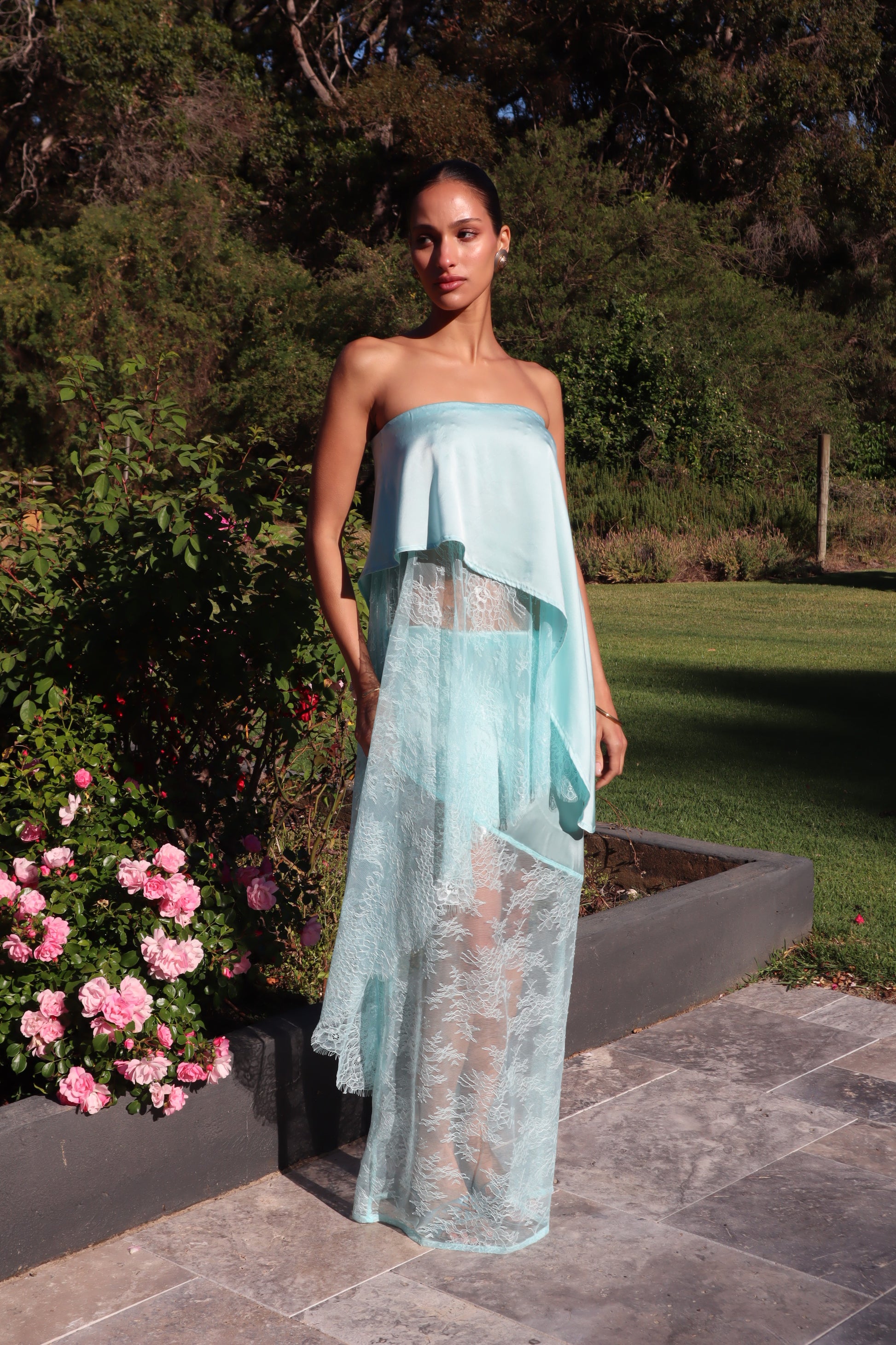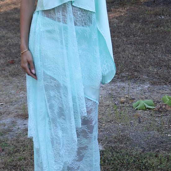 Introducing the AMSONIA, the newest addition to the Sol Bloom collection. This elegant set includes a top and skirt that together resemble a dress but can also be styled separately for versatile wear. Crafted from a luxurious blend of 90% silk and 10% spandex, the fabric drapes beautifully and moves effortlessly. Delicate Chantilly lace adds a feminine touch, while the bias-cut design enhances fluidity and shape. The top features a comfortable elasticated waistband, and the skirt is designed with diagonal seams that complement the circle silhouette of the top.