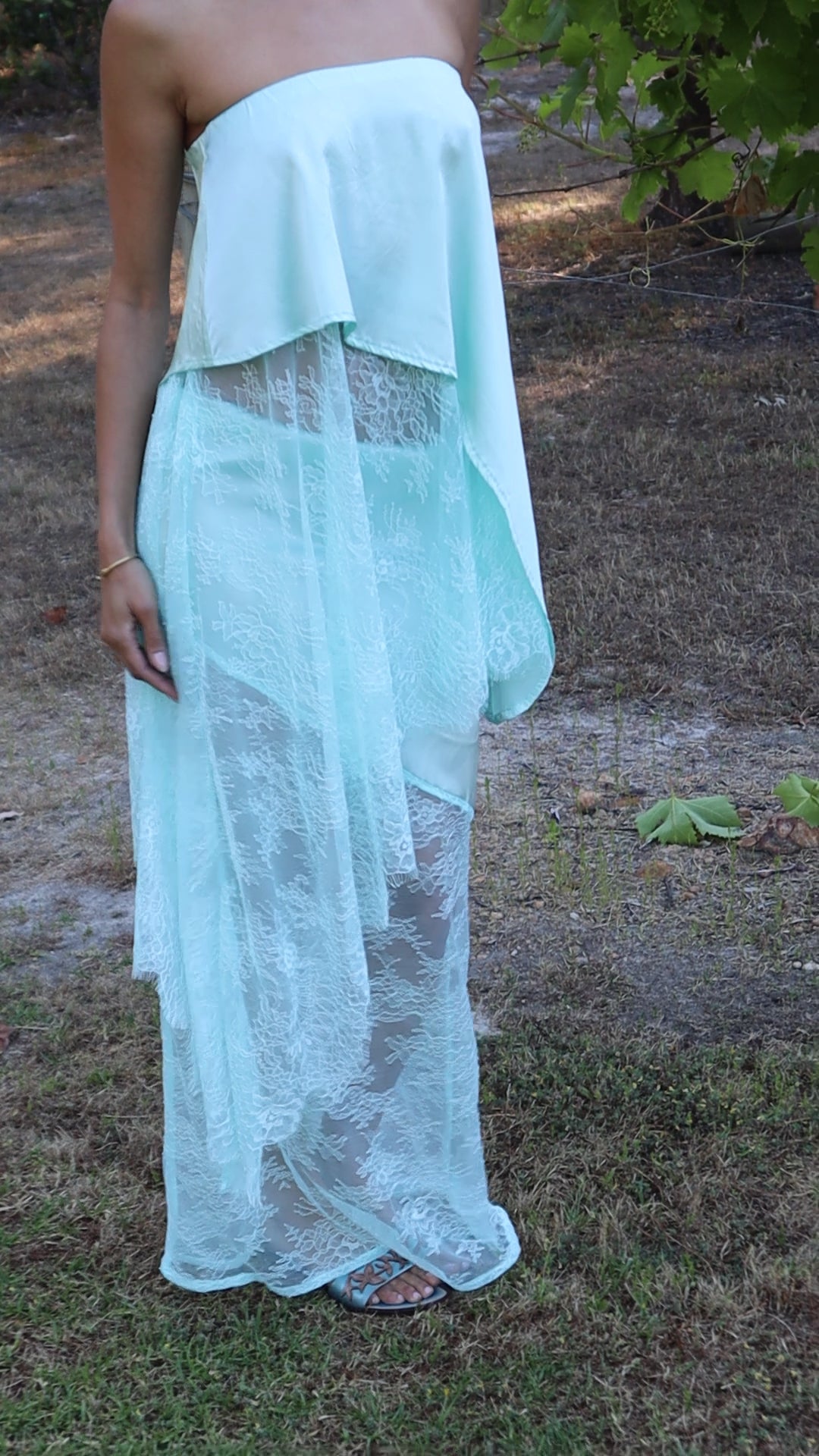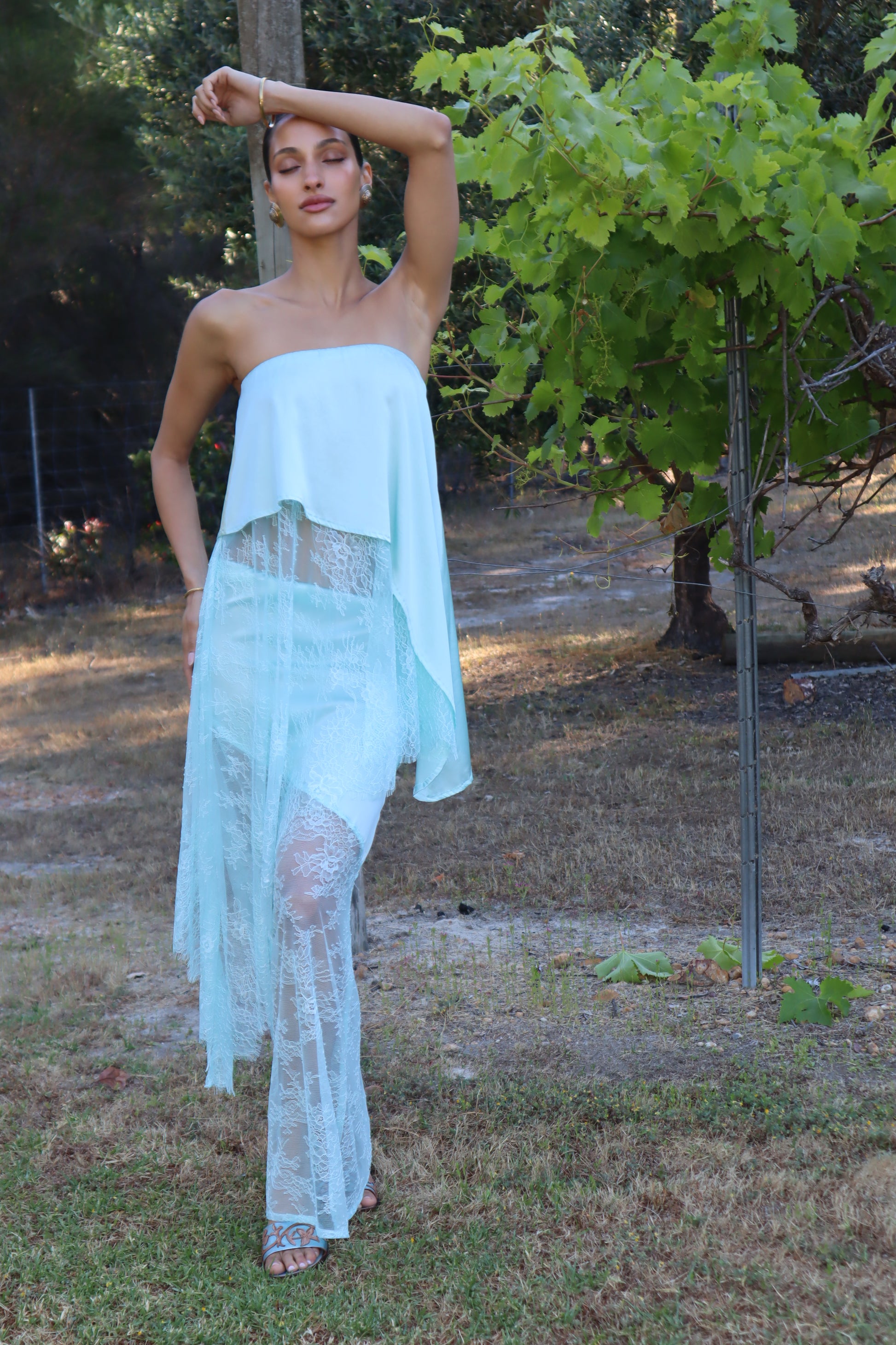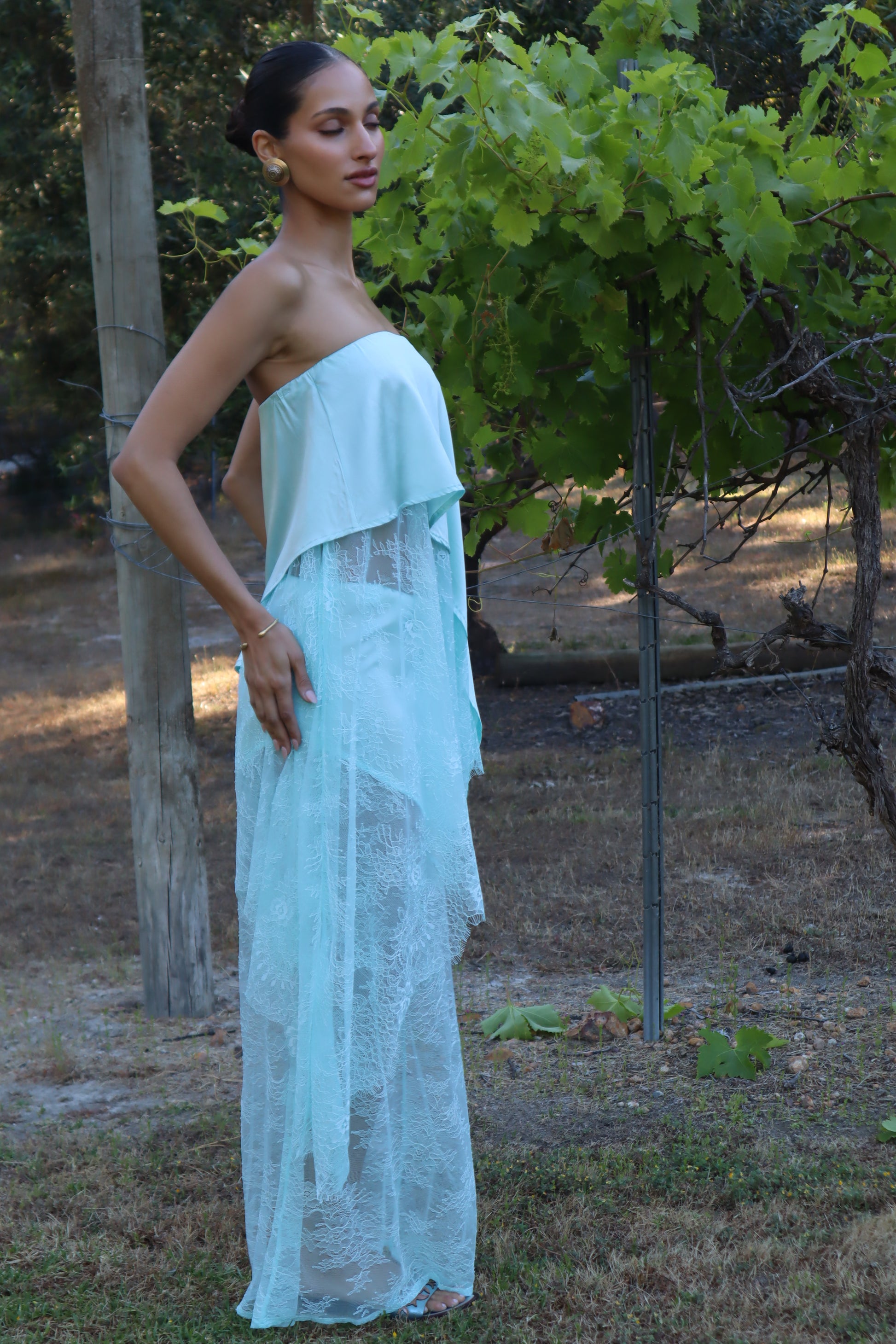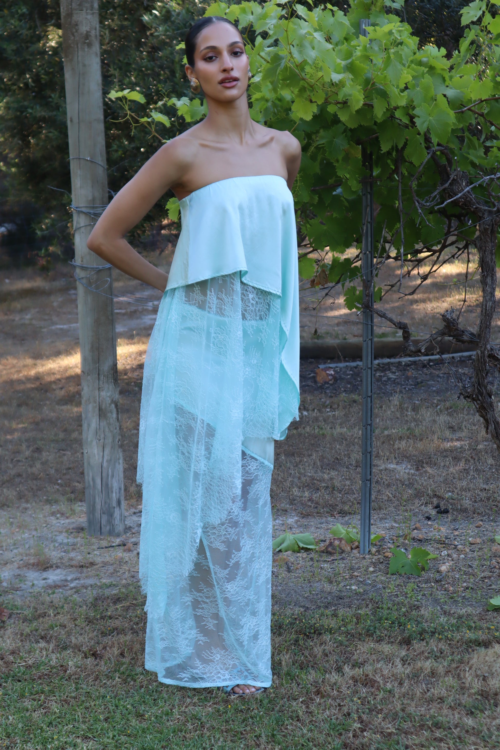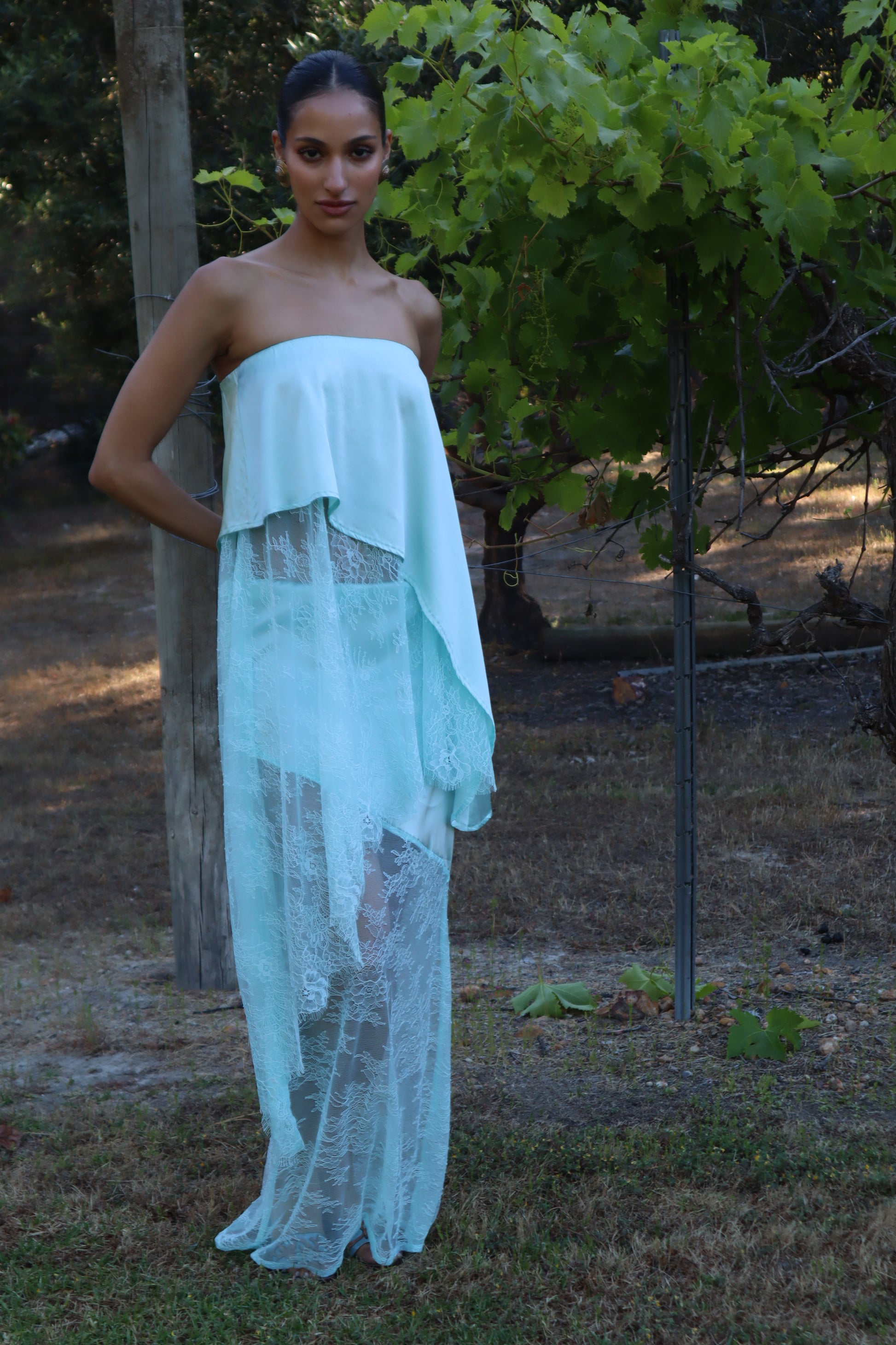 Introducing the AMSONIA, the newest addition to the Sol Bloom collection. This elegant set includes a top and skirt that together resemble a dress but can also be styled separately for versatile wear. Crafted from a luxurious blend of 90% silk and 10% spandex, the fabric drapes beautifully and moves effortlessly. Delicate Chantilly lace adds a feminine touch, while the bias-cut design enhances fluidity and shape. The top features a comfortable elasticated waistband, and the skirt is designed with diagonal seams that complement the circle silhouette of the top.