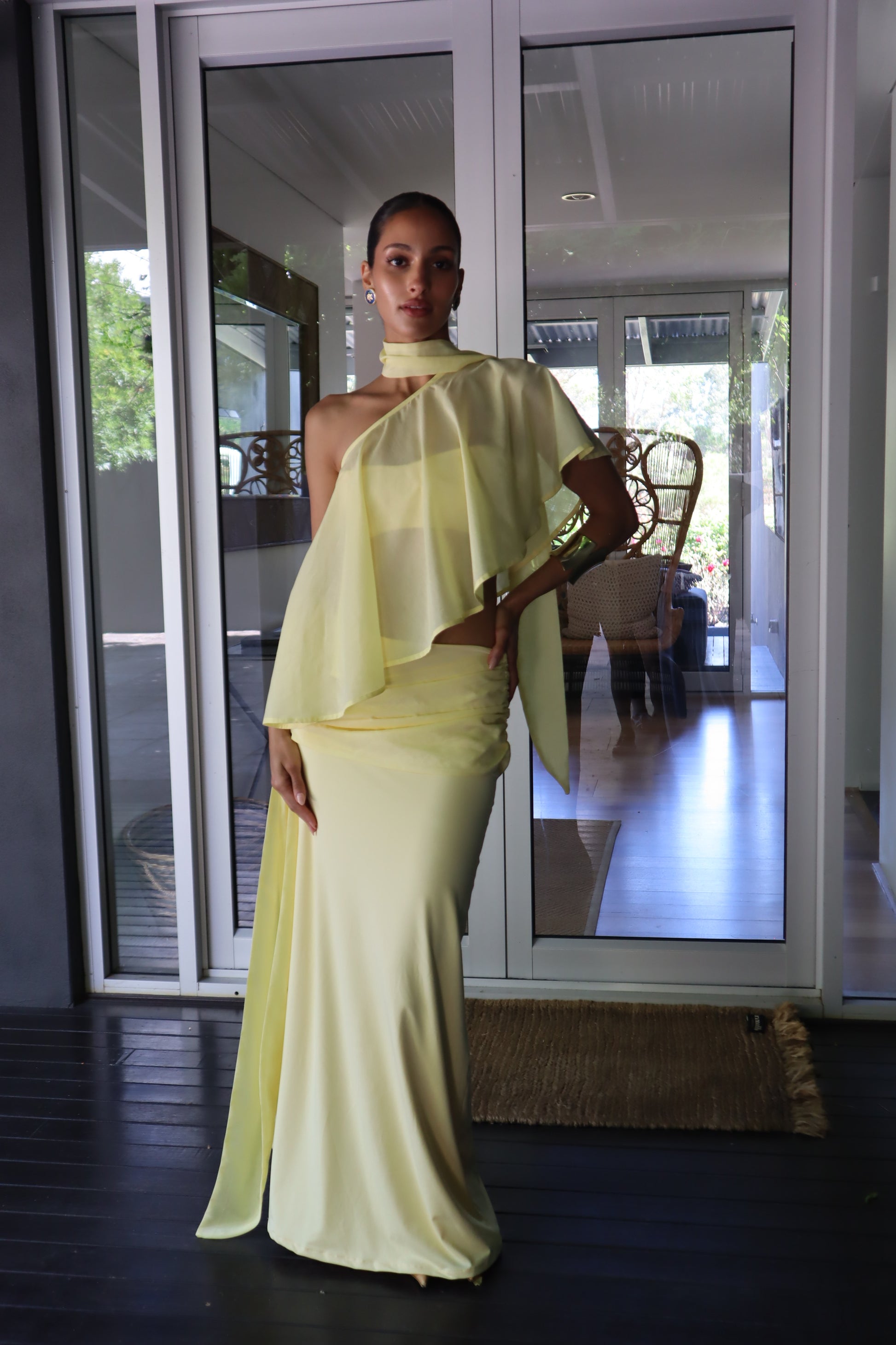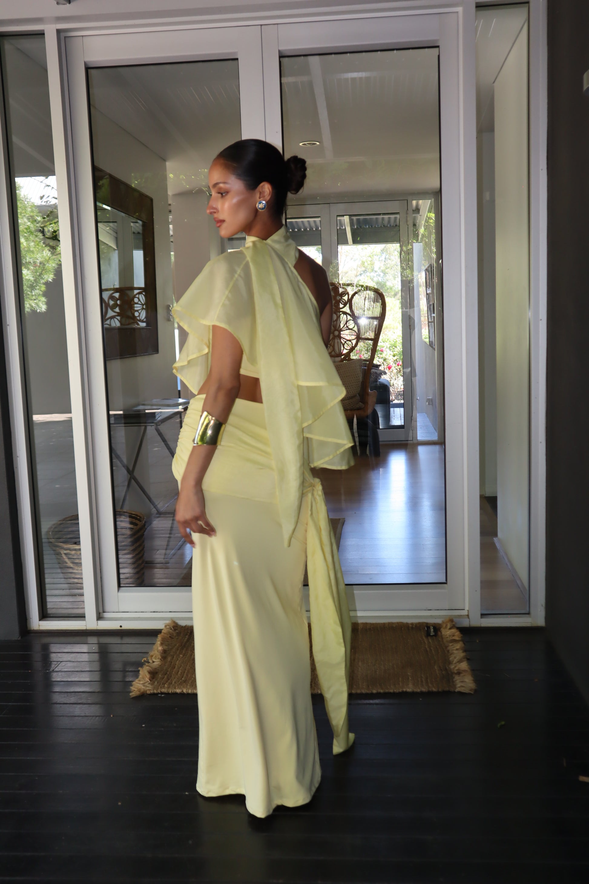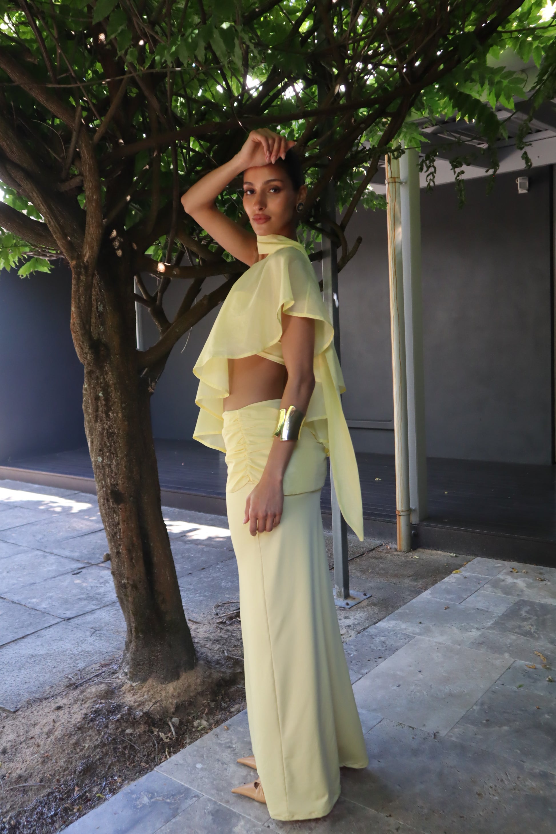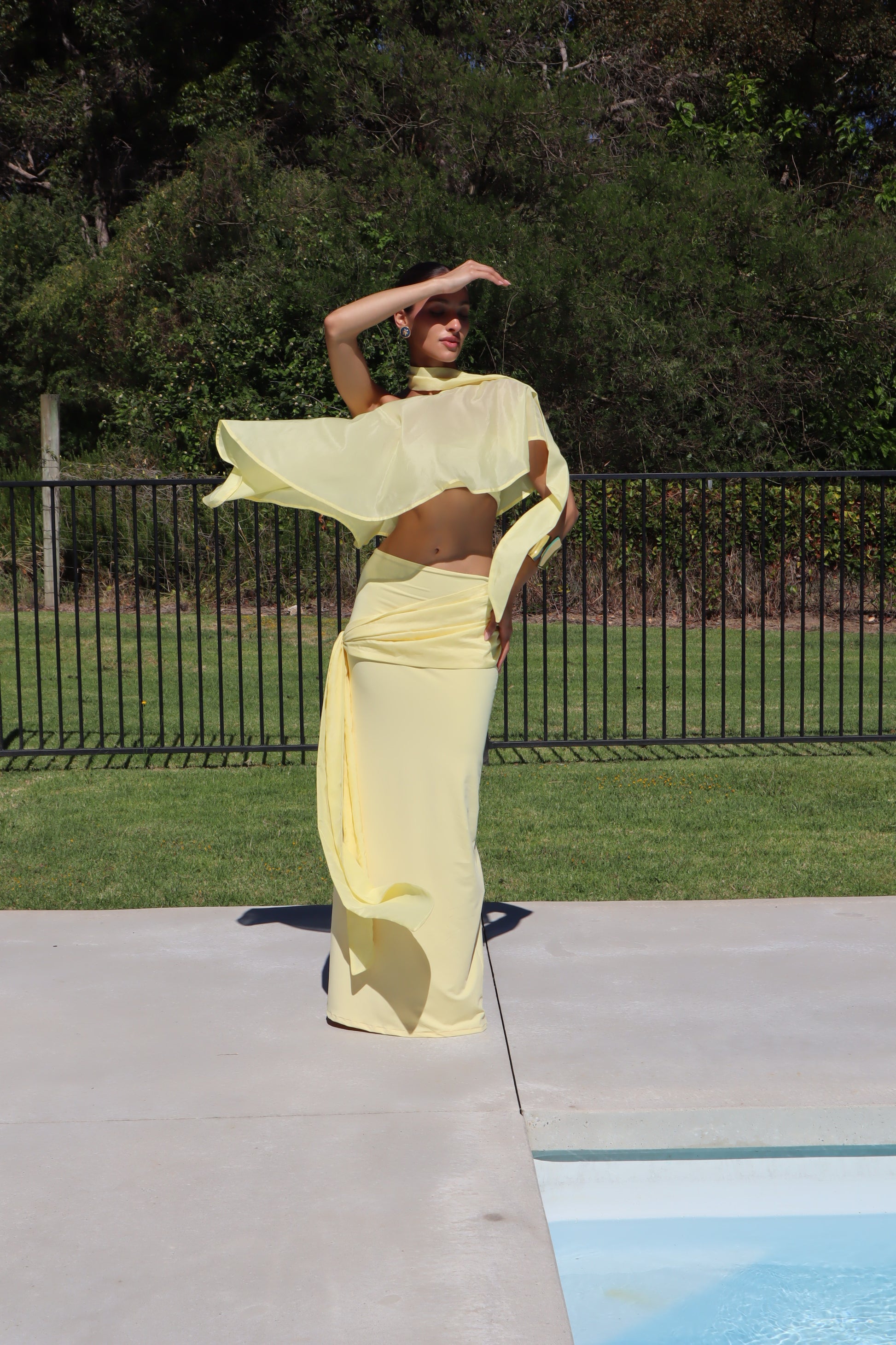 The newest addition to our SOL BLOOM: Part I collection. This ensemble features a versatile top-and-skirt set designed to be worn together or styled separately. The cape-inspired silhouette is timeless—soft, fluid, and effortless in movement, creating a truly beautiful wearing experience.