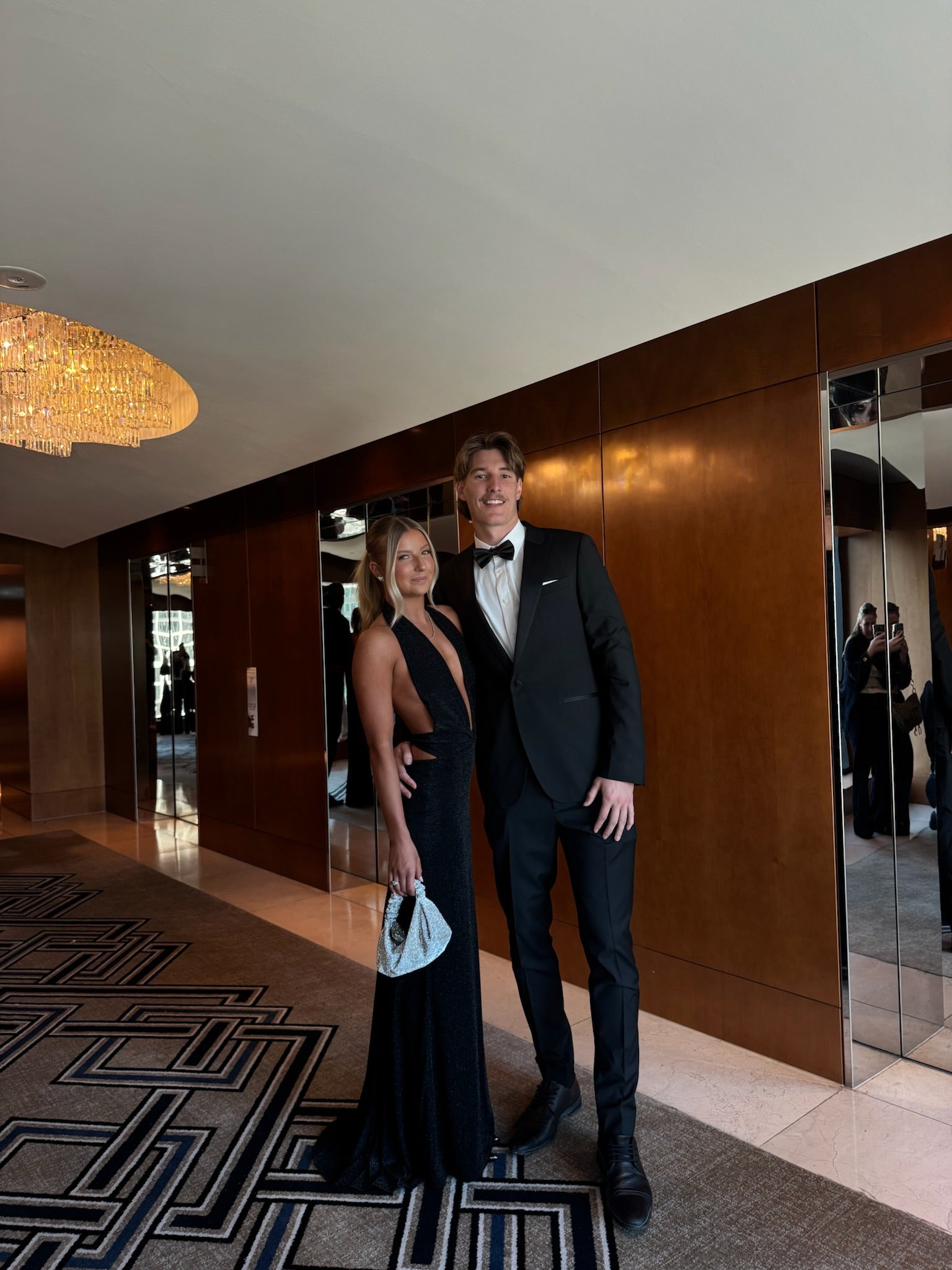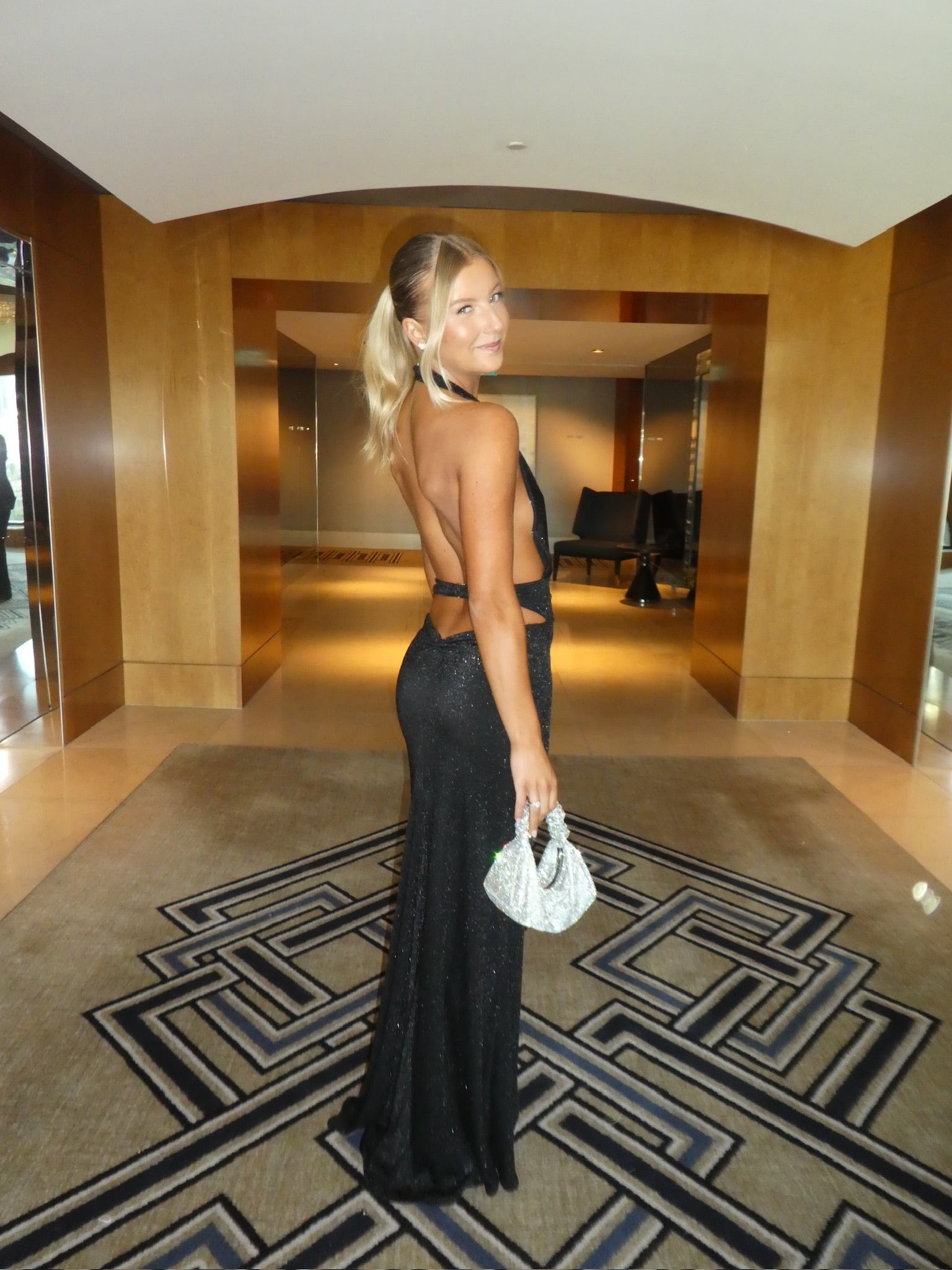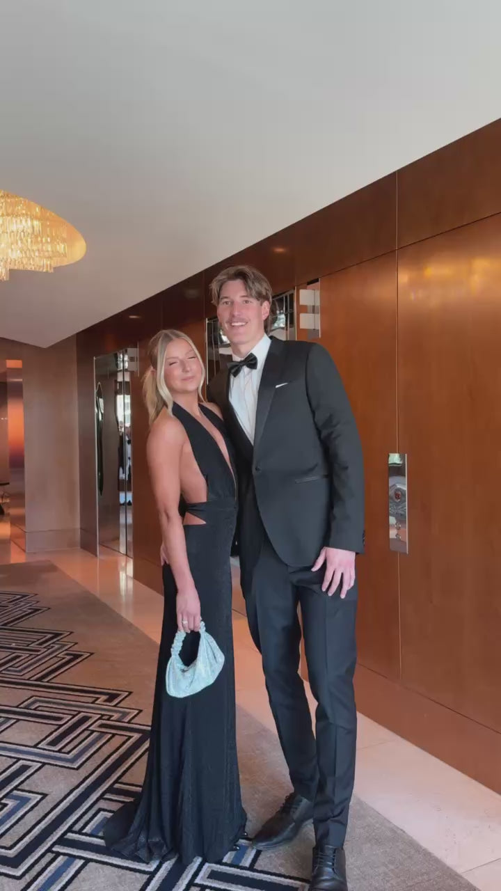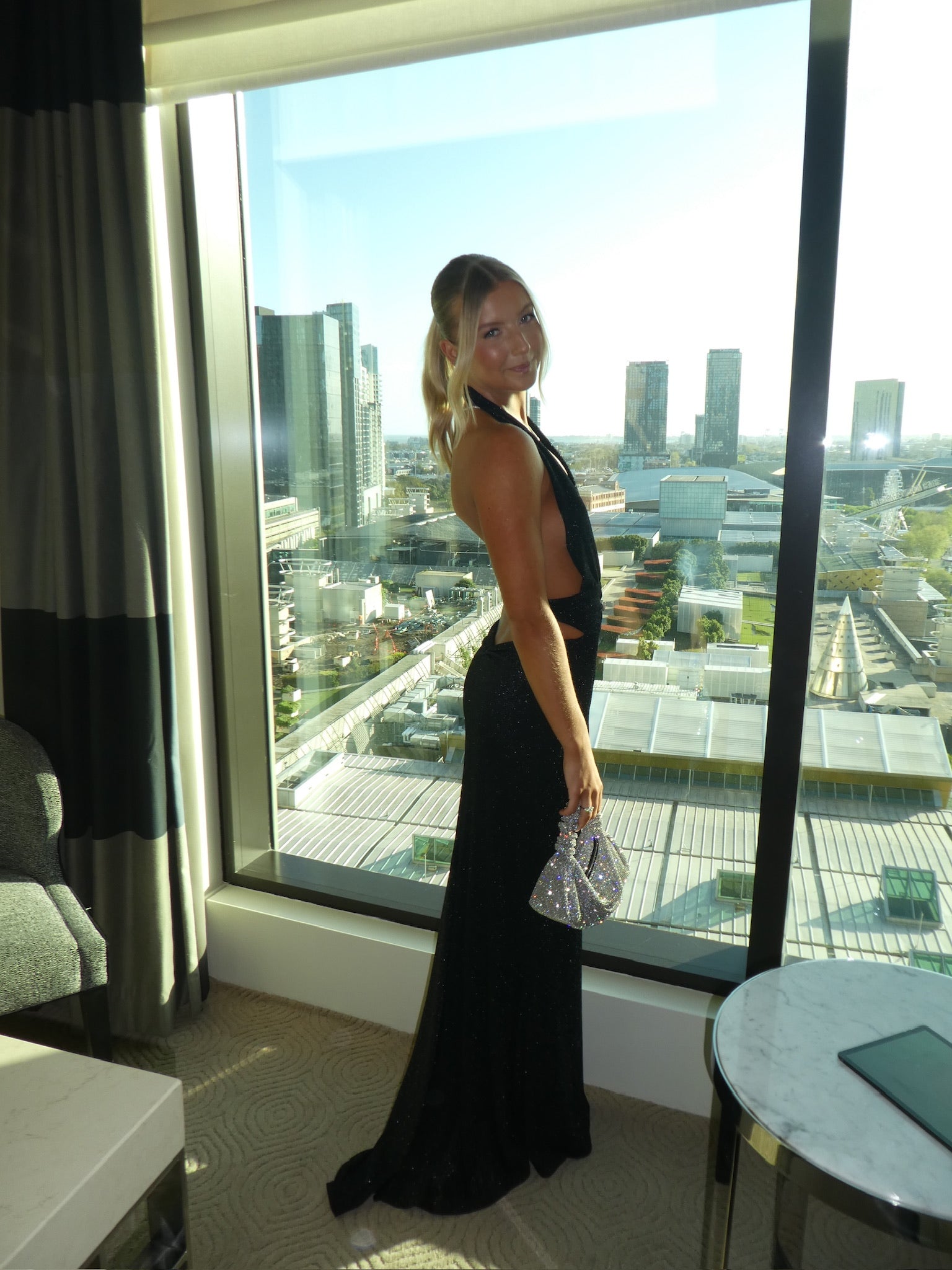 Introducing The Paige — named after our stunning client who debuted it at Brownlow 2025. A modern twist on a classic silhouette, with a ruched middle panel, gold back clasp, and sleek high neck. The dramatic train and godet steal the show.
