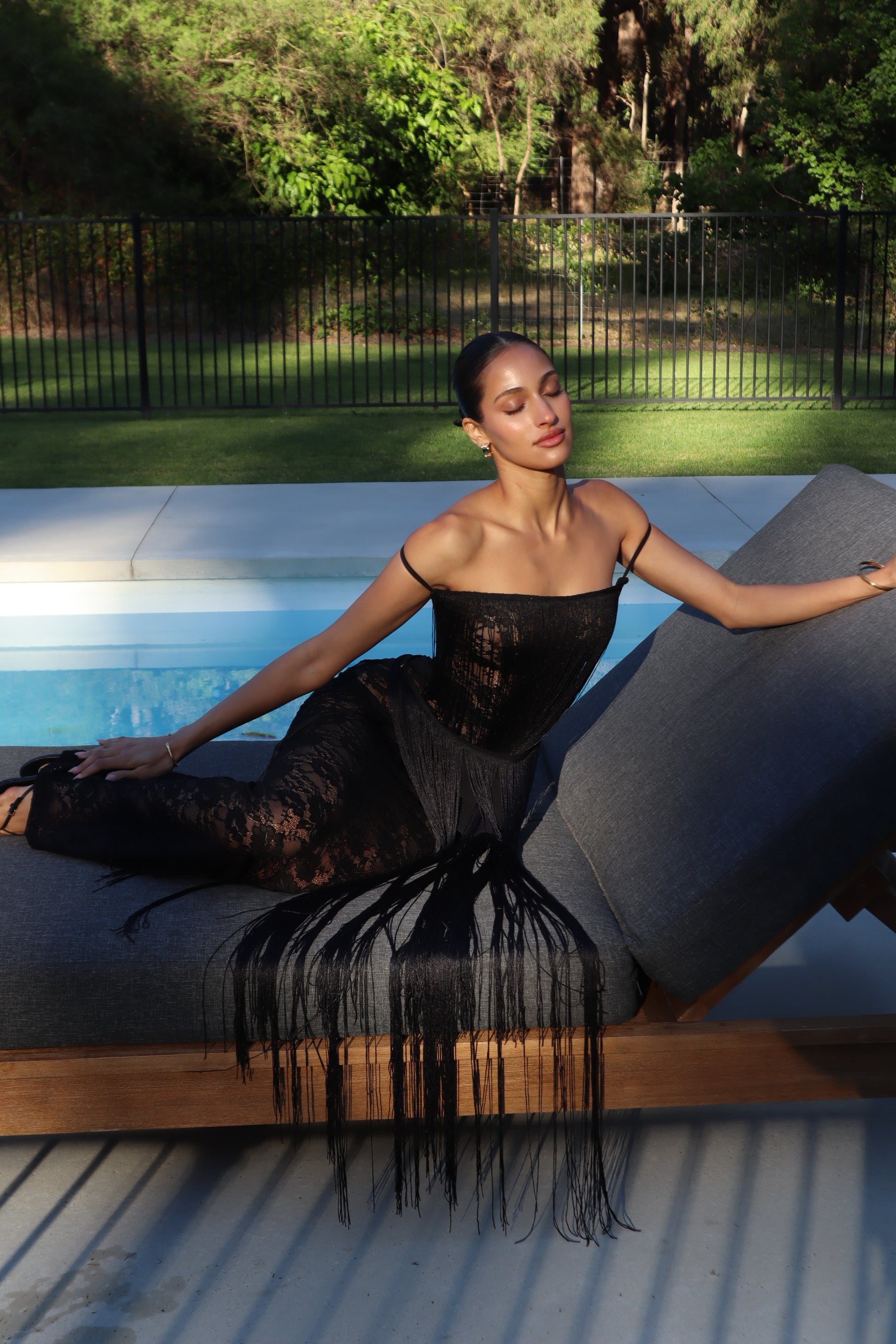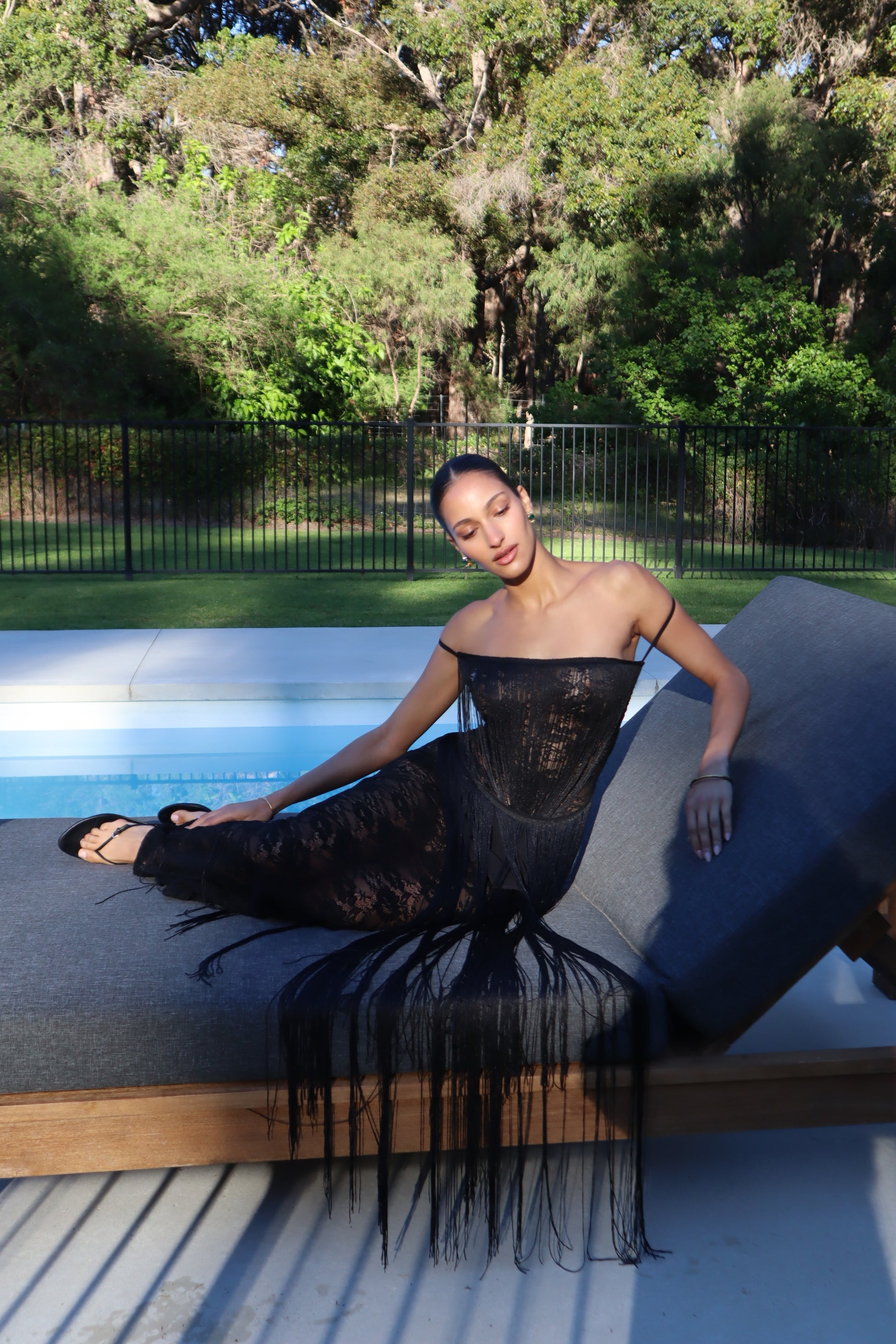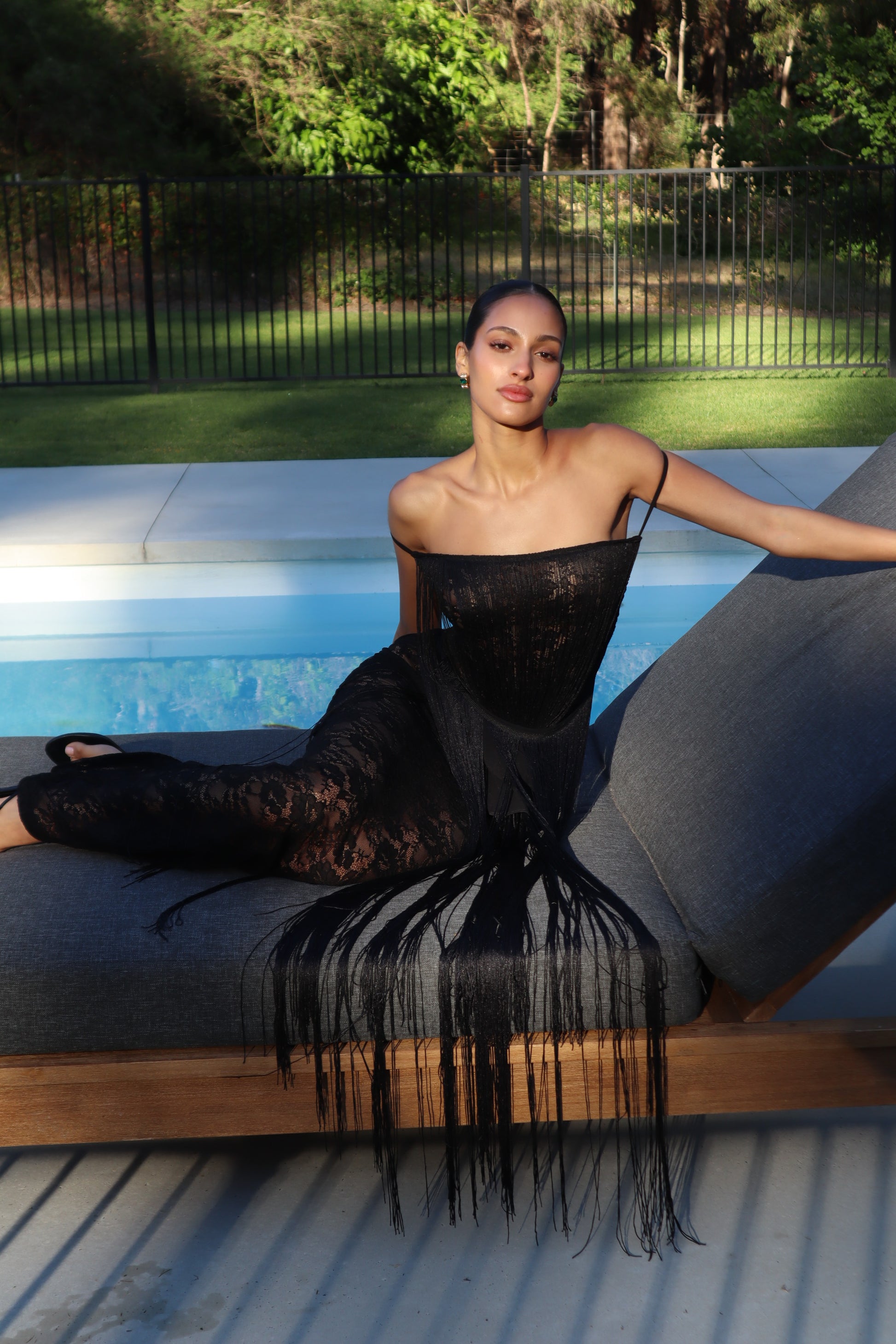 Introducing the PETUNIA — a fresh and distinctive style from Deconduarte as part of the Sol Bloom collection. This layered piece features a sheer lace bodice with fringe details that provide subtle coverage, creating a delicate look. The design includes two clasps at the shoulder and waist to cinch in the fit, with easy access via a side press-stud. The bottom fringe layer sits over a mesh skirt to ensure coverage, while sheer detailing around the bust adds an elegant touch, making this piece both bold and feminine.