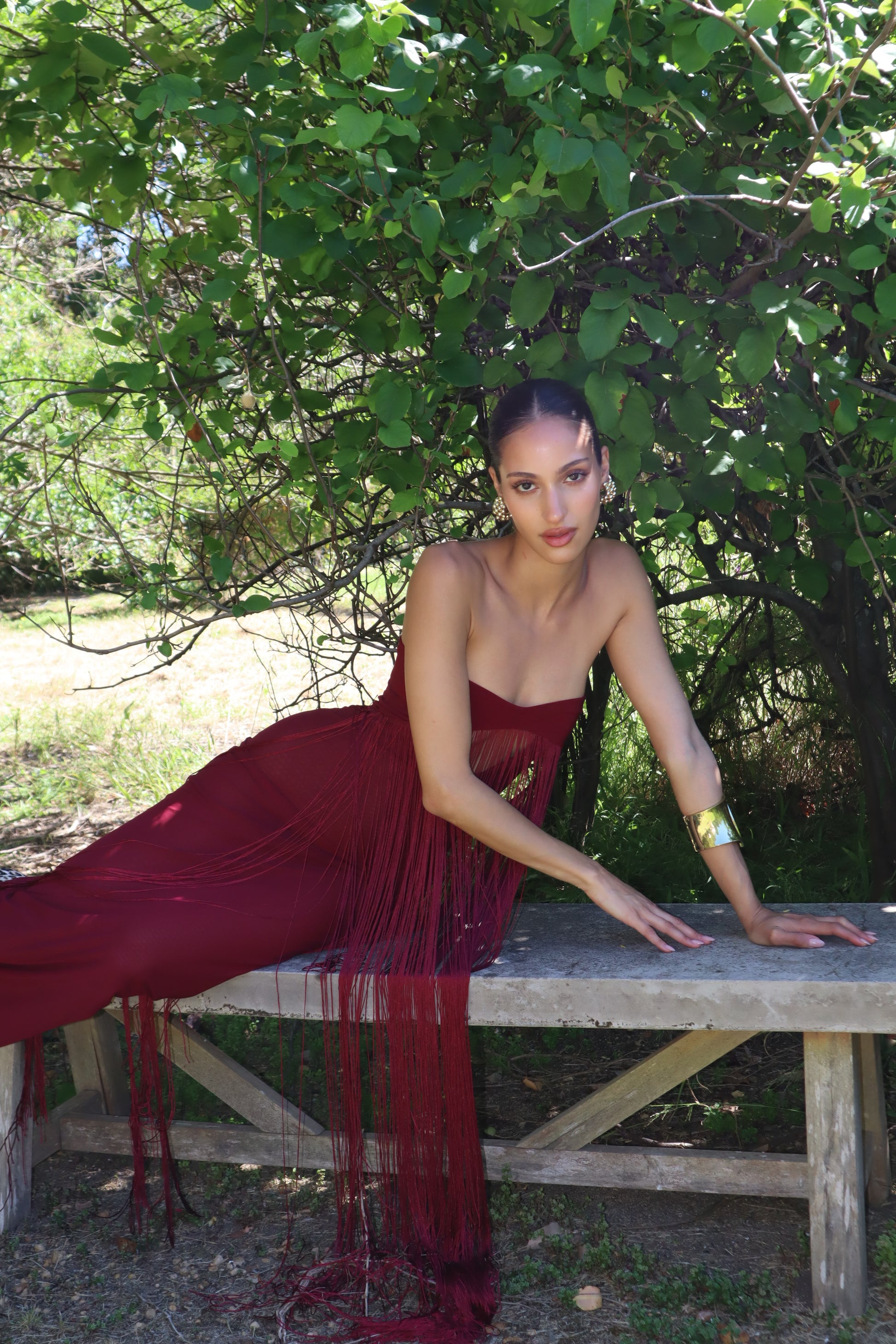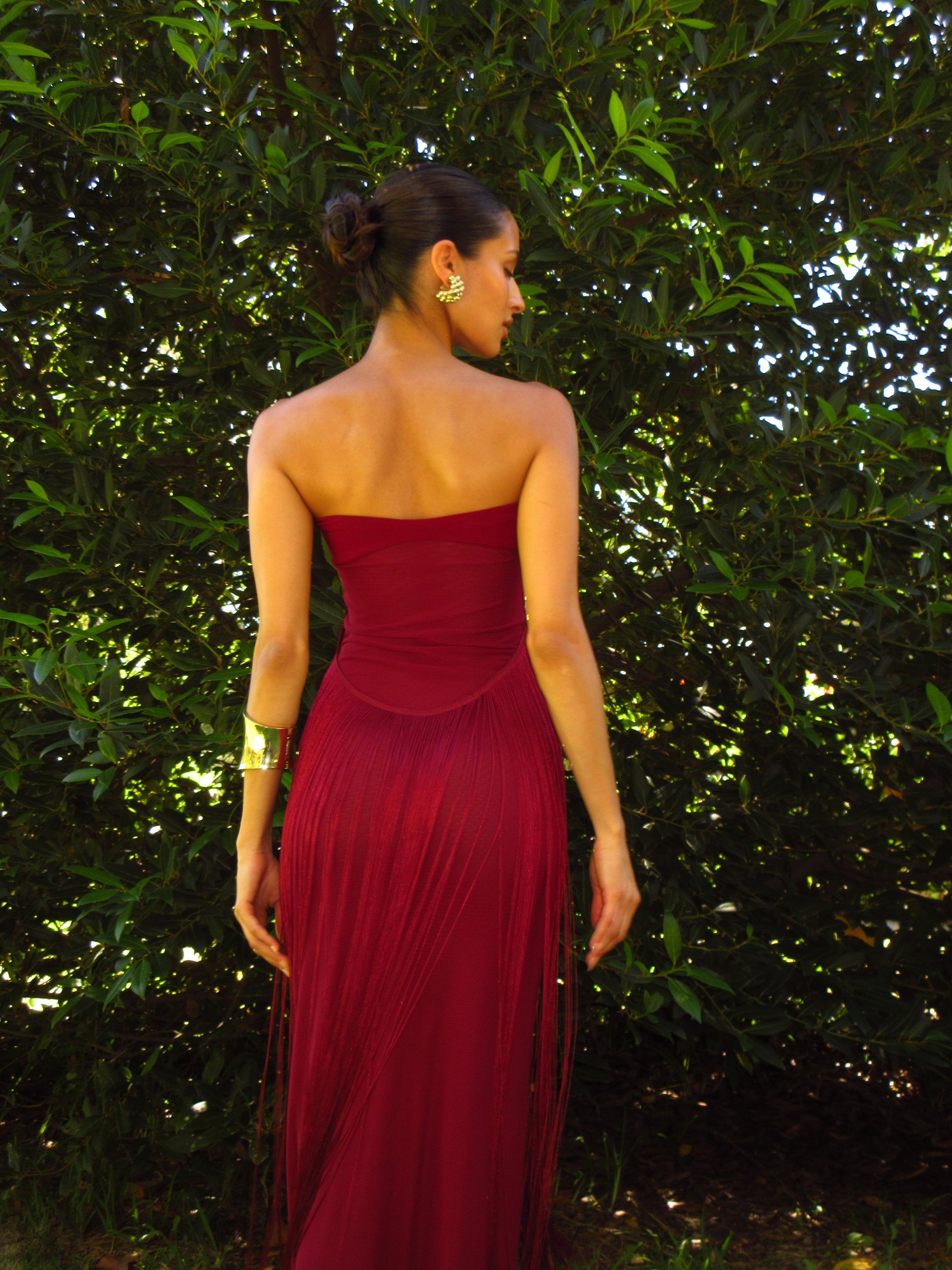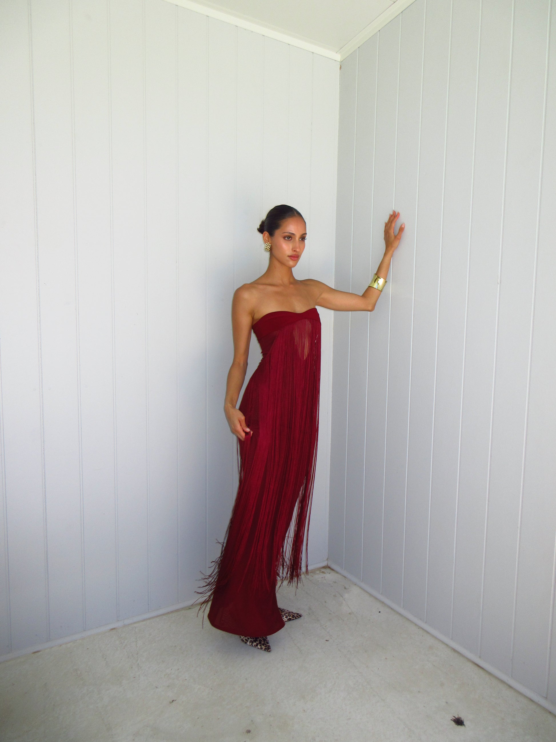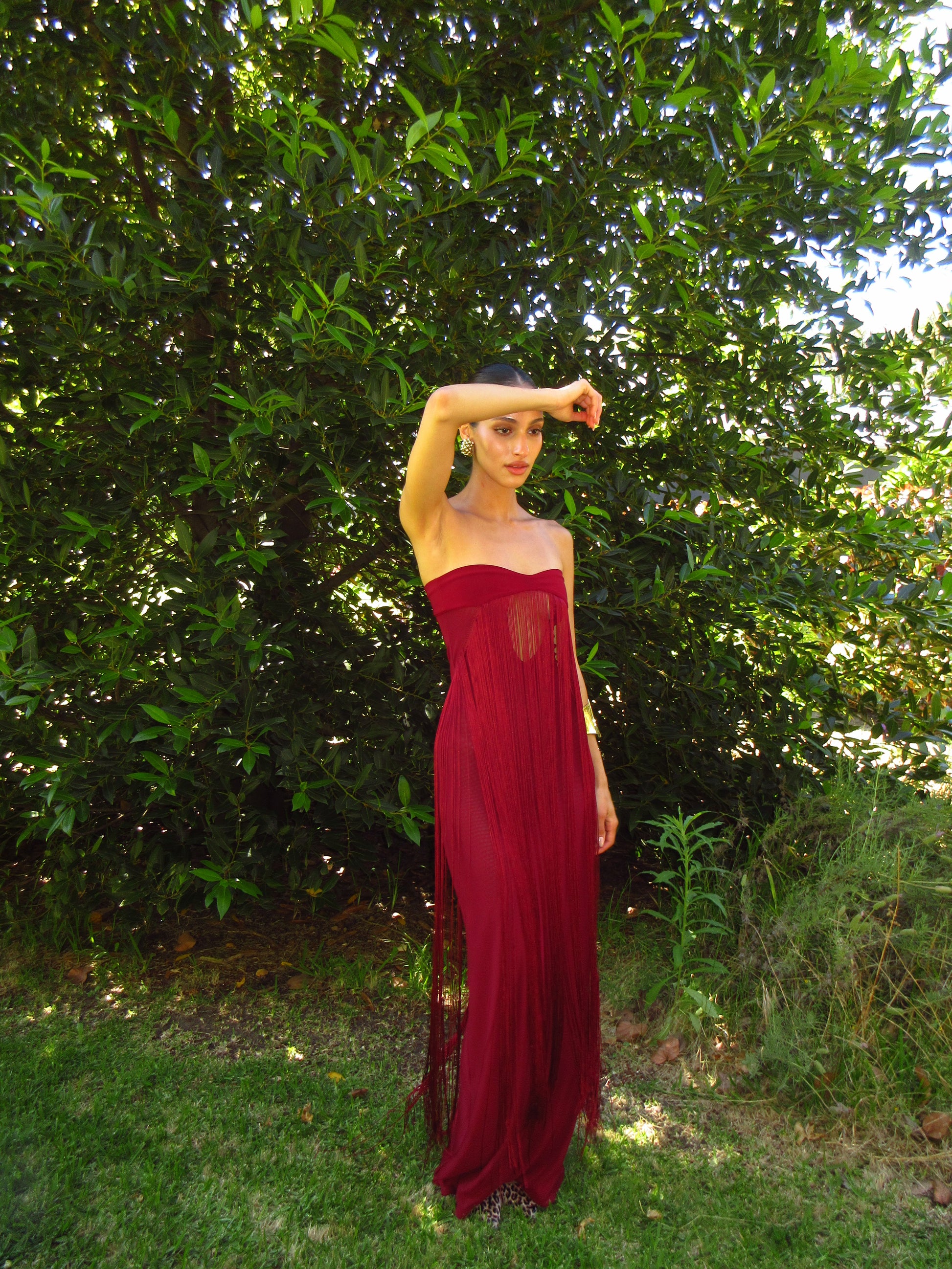 Double-lined with mesh, the dress retains a subtle sheer quality, while the fringe ensures comfort and coverage. The low-back detailing, beautifully framed by the fringe, creates a striking and unexpected finish that makes this piece truly captivating.