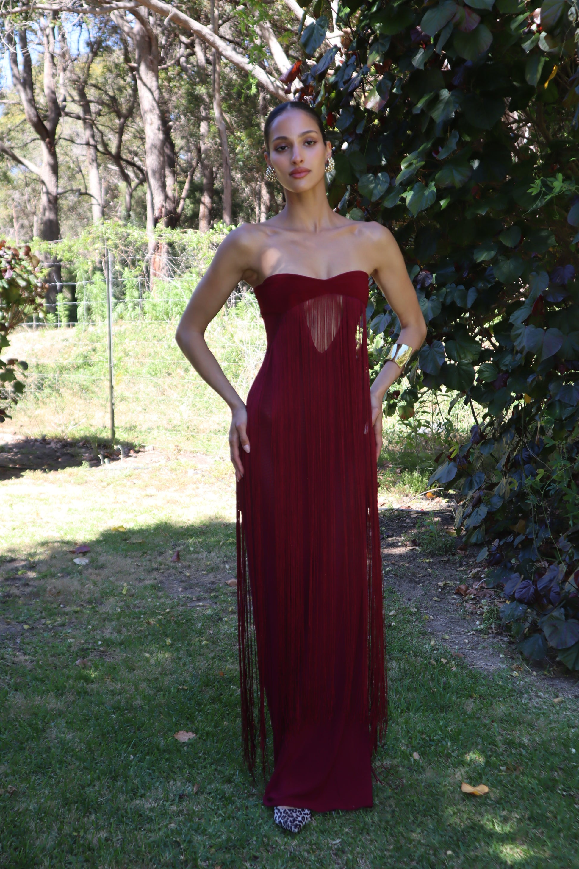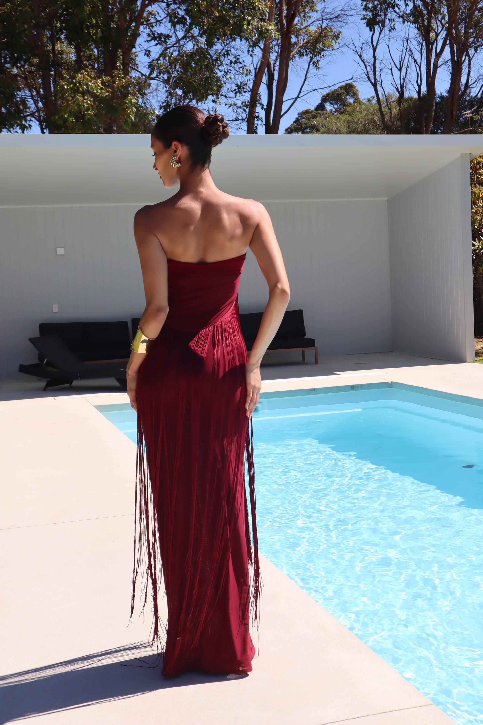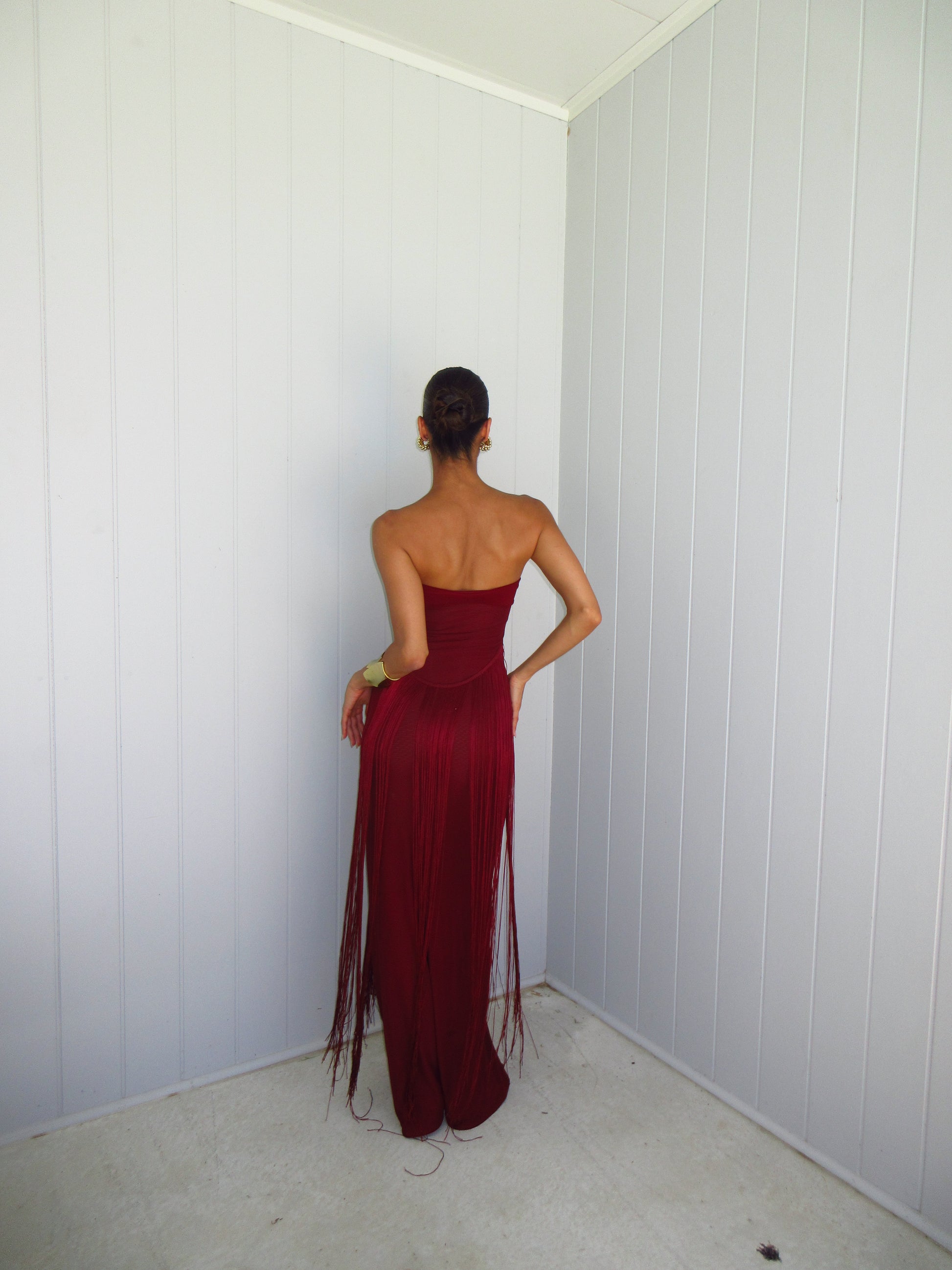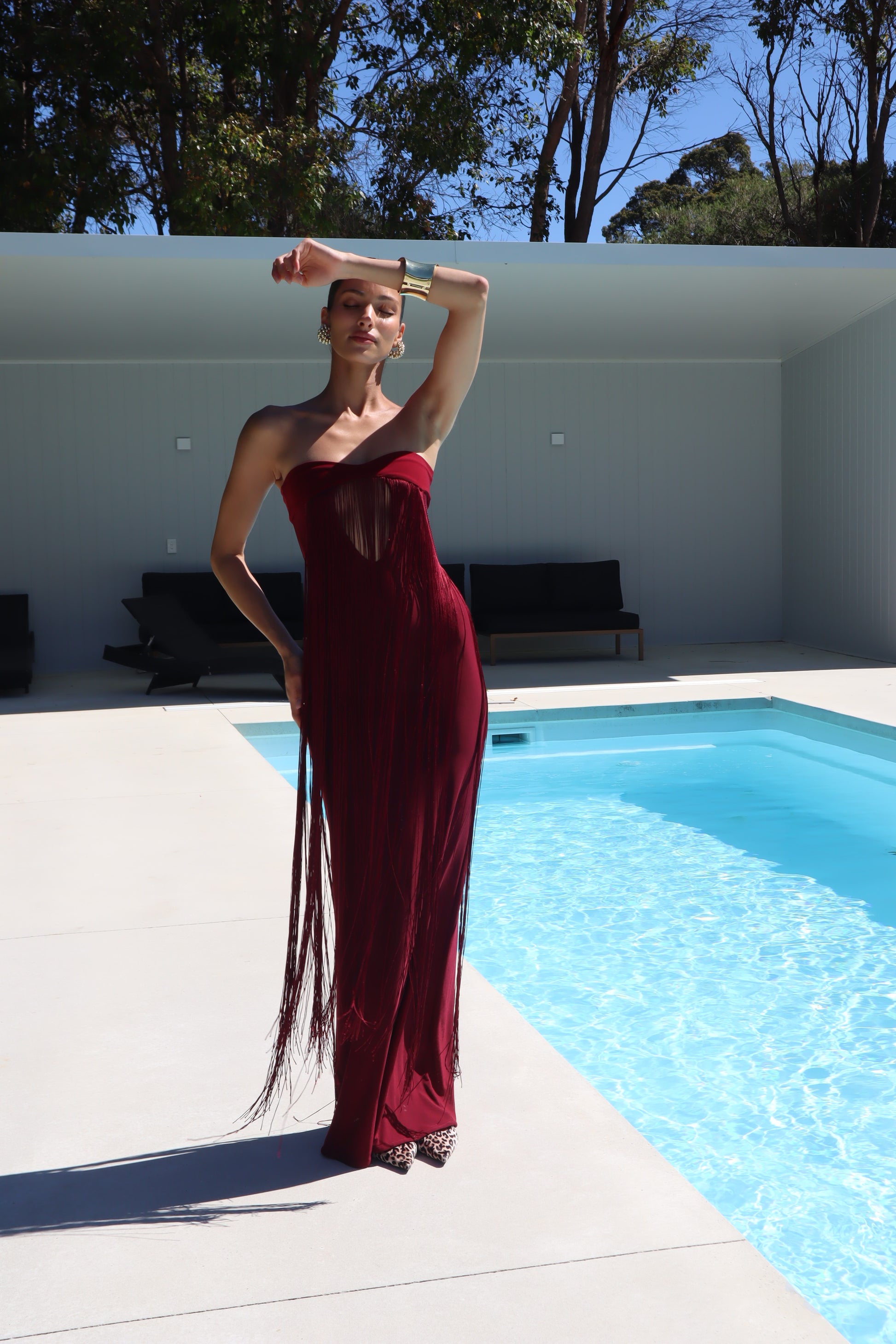 Double-lined with mesh, the dress retains a subtle sheer quality, while the fringe ensures comfort and coverage. The low-back detailing, beautifully framed by the fringe, creates a striking and unexpected finish that makes this piece truly captivating.