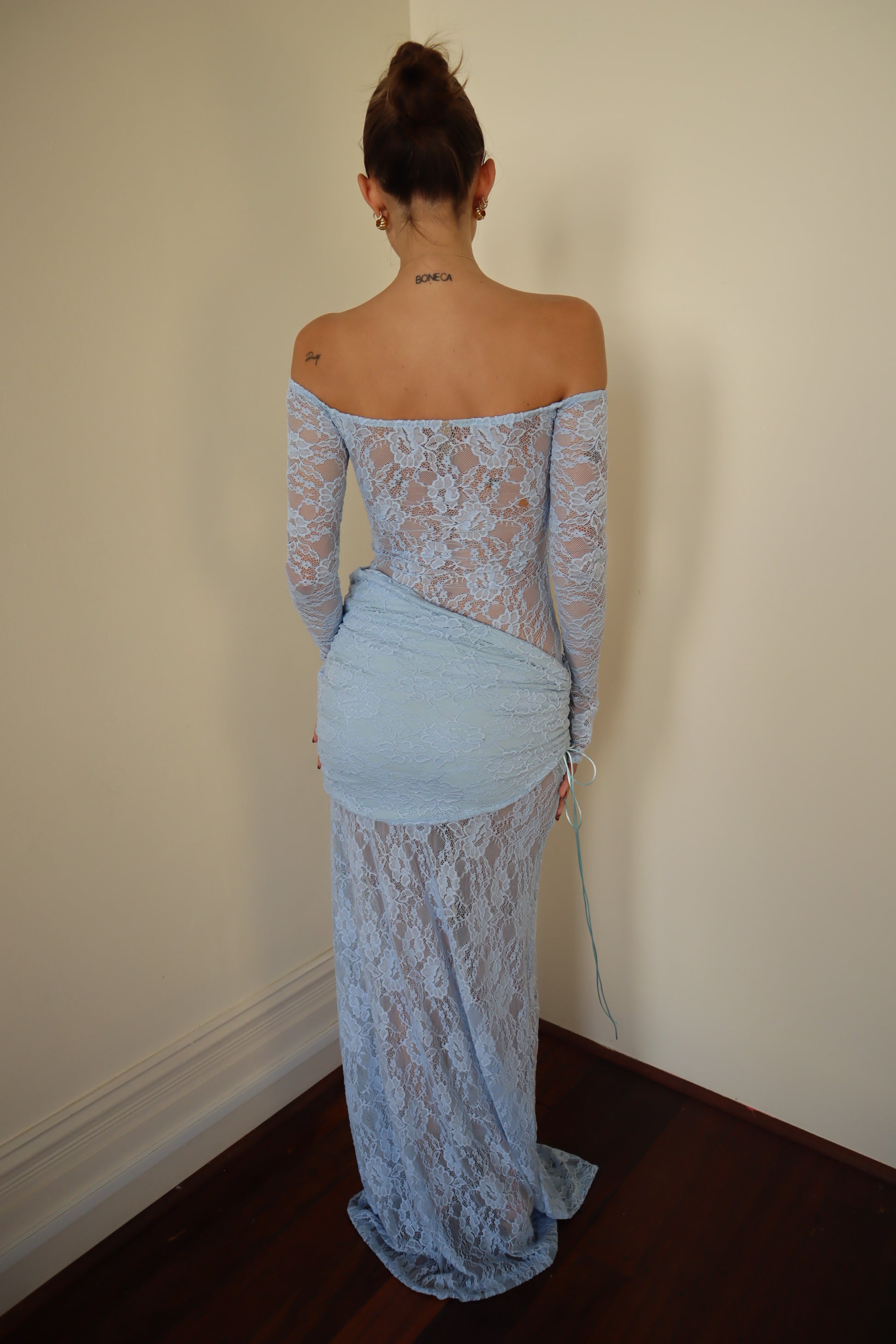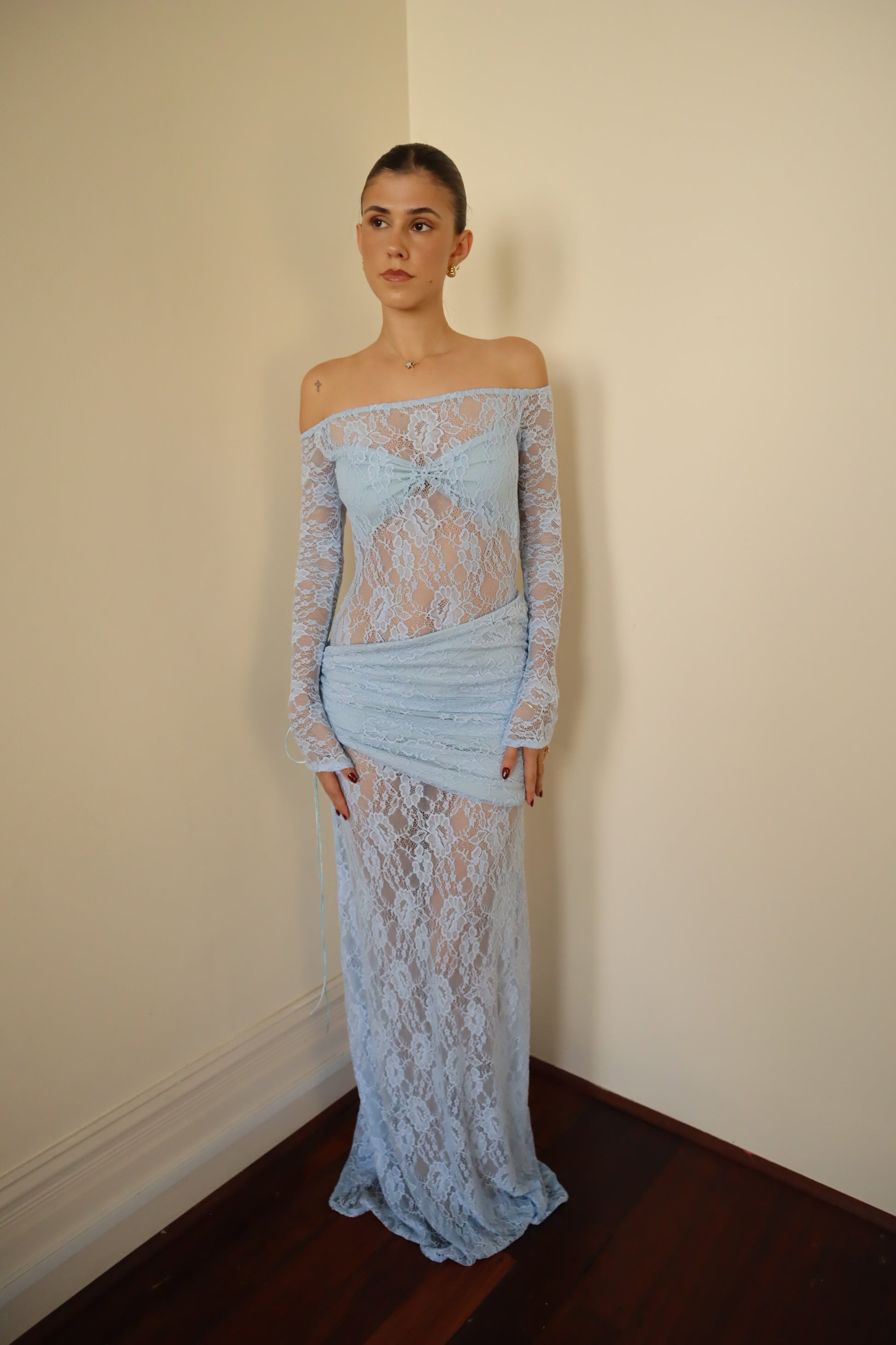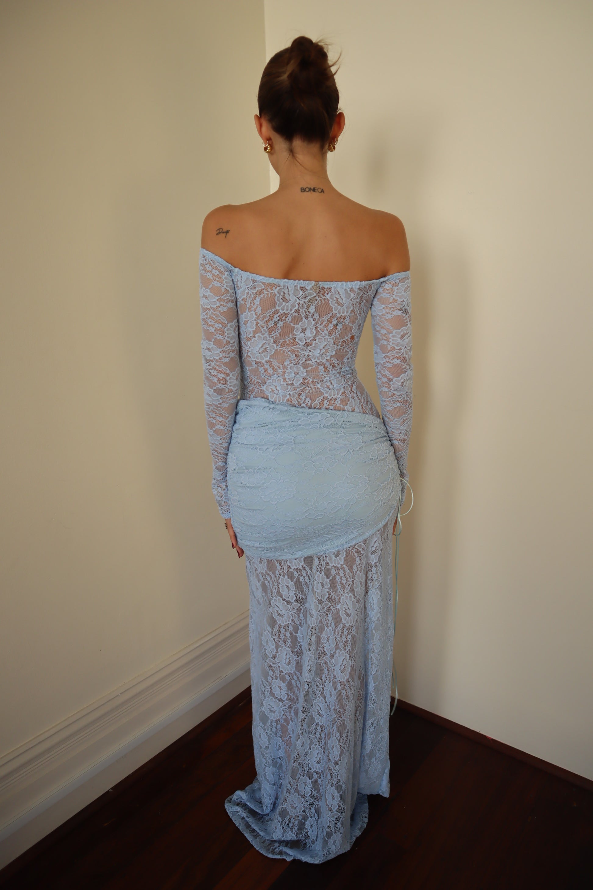 CHRISTIANA, the newest addition to our collection. A delicate lace sheer dress, featuring elements strategically placed to elegantly frame the bust and enhance the silhouette. The style has a seperate overskirt which can be worn however you see fit. The style is a perfect hybrid between our CARMINE and MILANO styles. The fully lace backless silhouette adds a touch of chic to the ensemble. While it's a natural choice for cooler months' events, its sheer construction ensures it remains a wardrobe staple across all seasons.