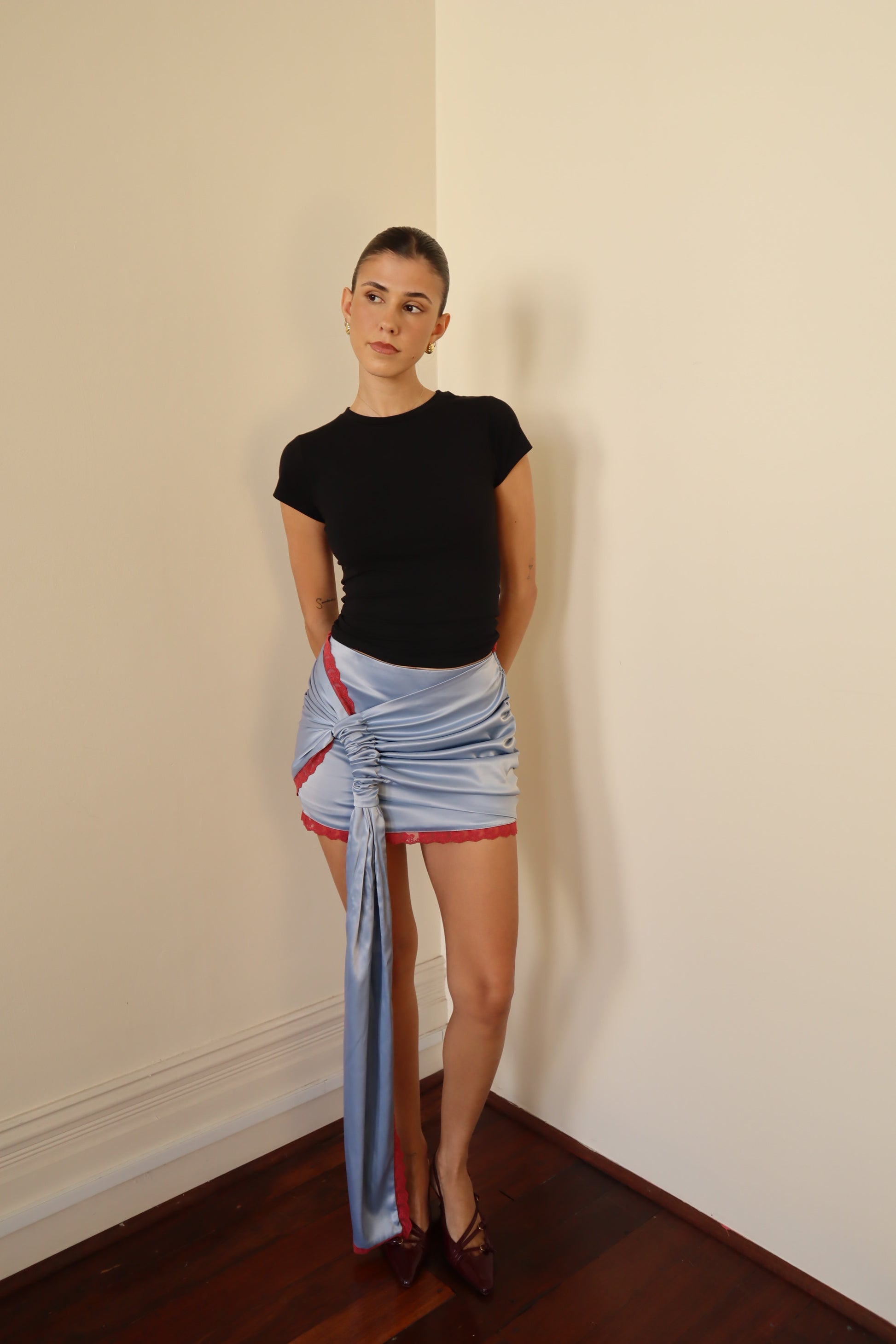 The A-line mini skirt features a unique over-belt design that’s semi-adjustable, allowing you to customise the fit and silhouette. The belt’s tail threads through the channel, so you can tighten or loosen it to your preference. Plus, the slightly longer back ensures a sophisticated and polished finish
