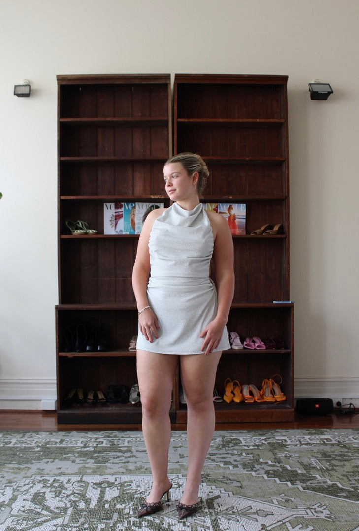The THERASIA mini features a stunning high neck, accentuated by strong ruching over the bust and torso, evoking an effortlessly chic vibe. The waist is artfully cinched with an tie detail, through hidden golden rings ensuring a flattering silhouette. The fully adjustable bust string and halter strings add a personalized touch to the ensemble.