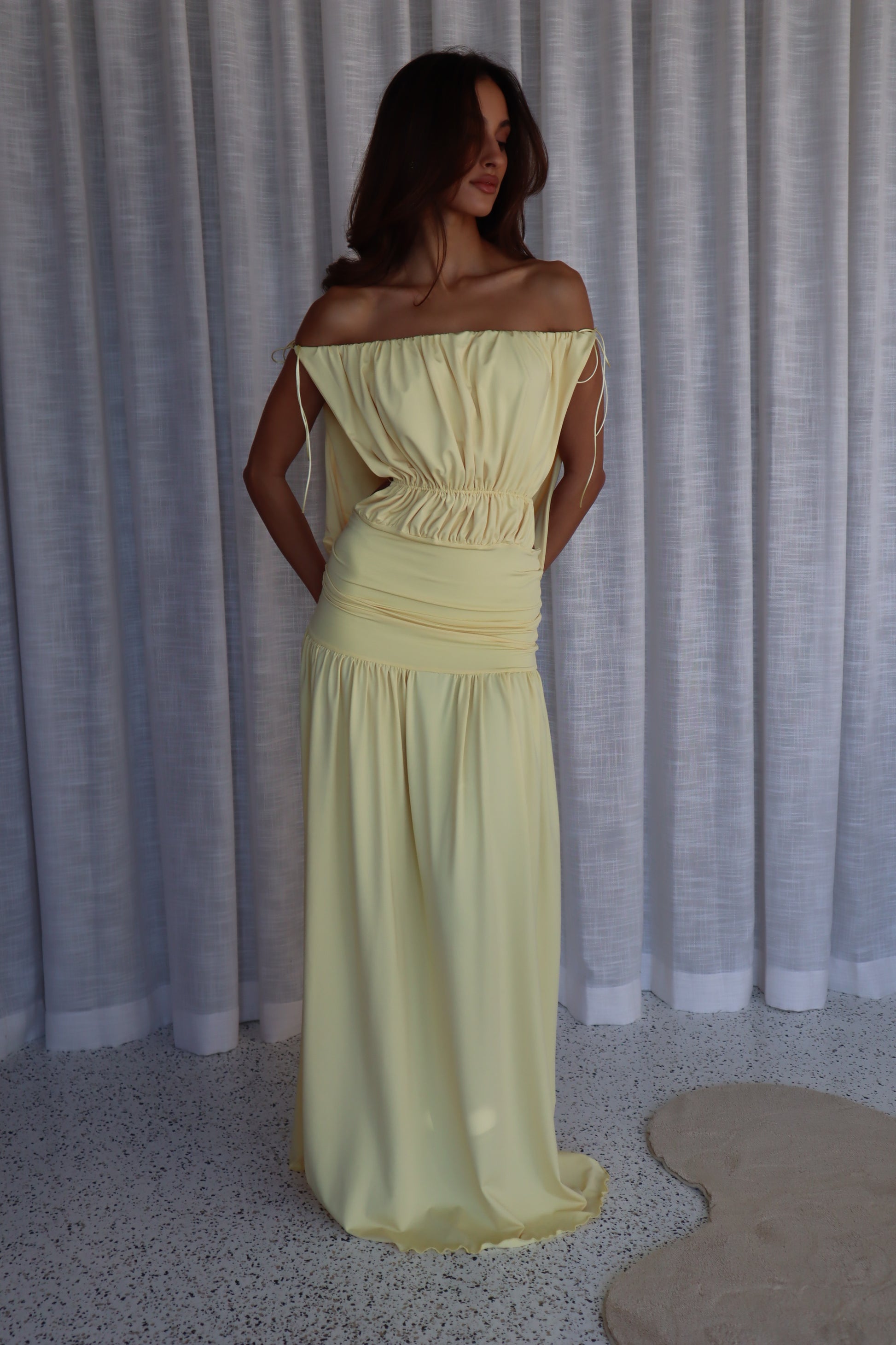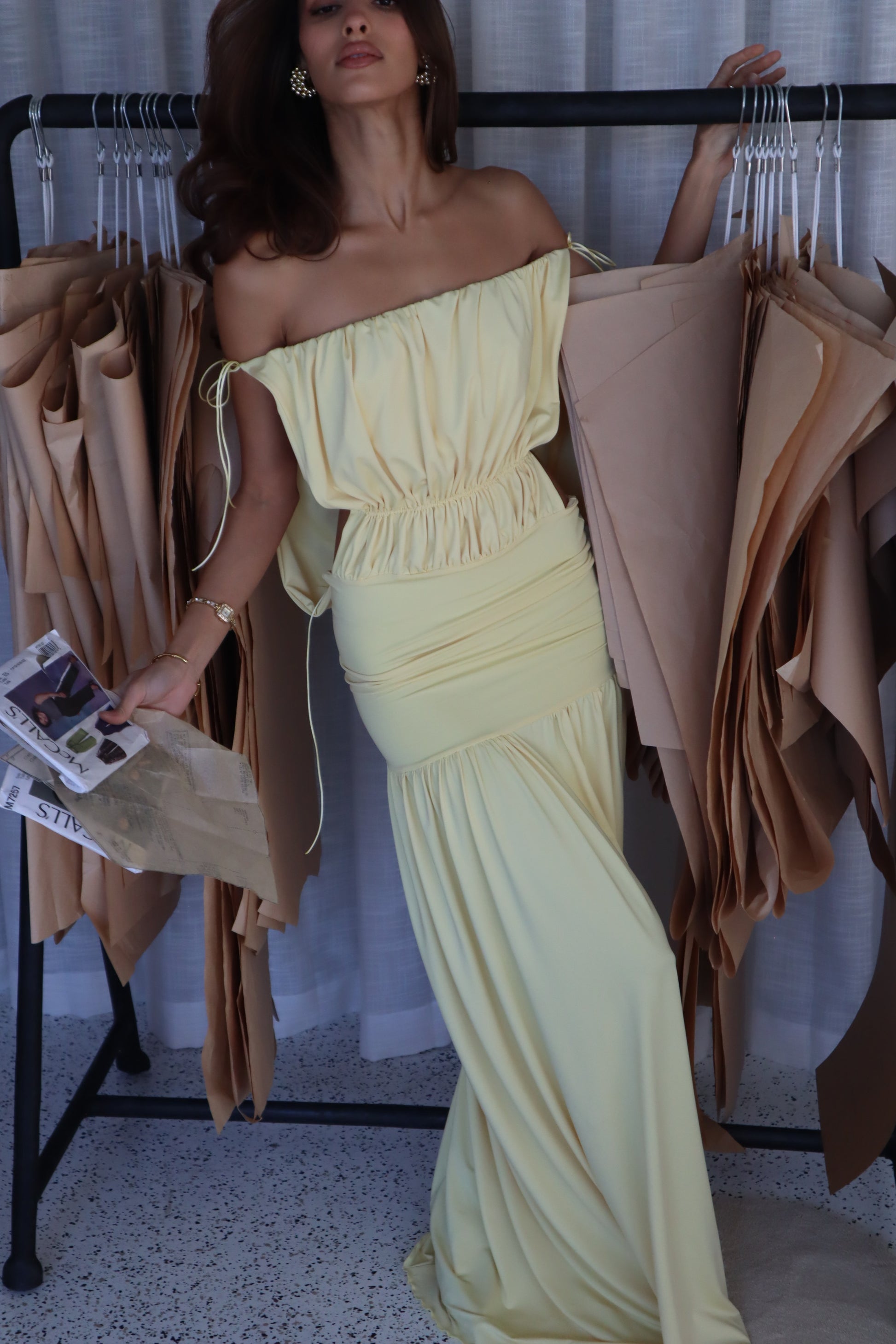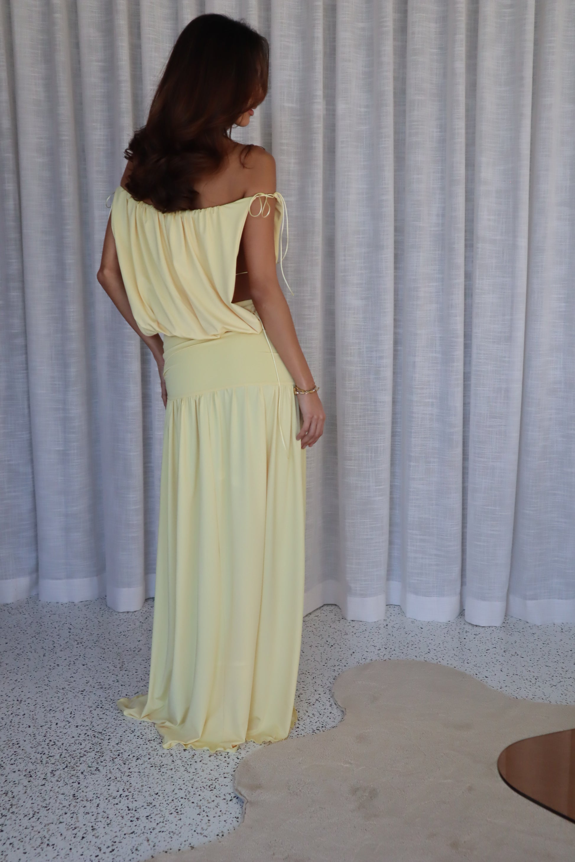 The skirt features a belted section, allowing you to adjust and distribute the fabric to your liking, flowing into a graceful draped hemline that makes this piece perfect for any summer formal event.
