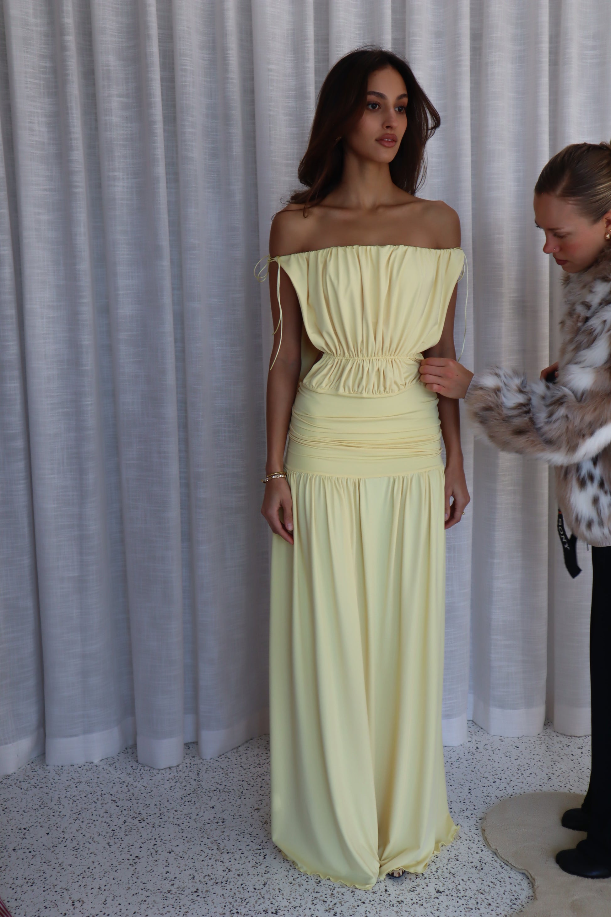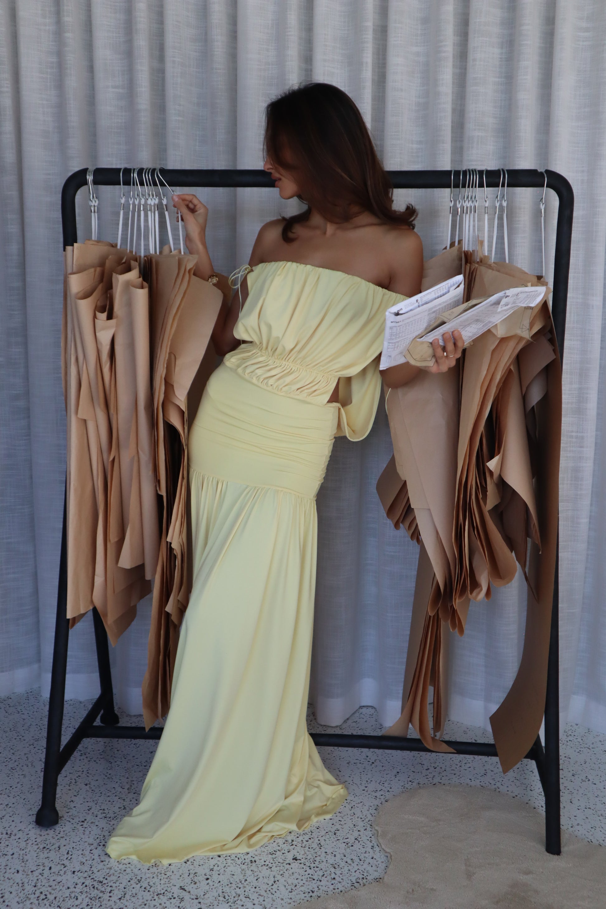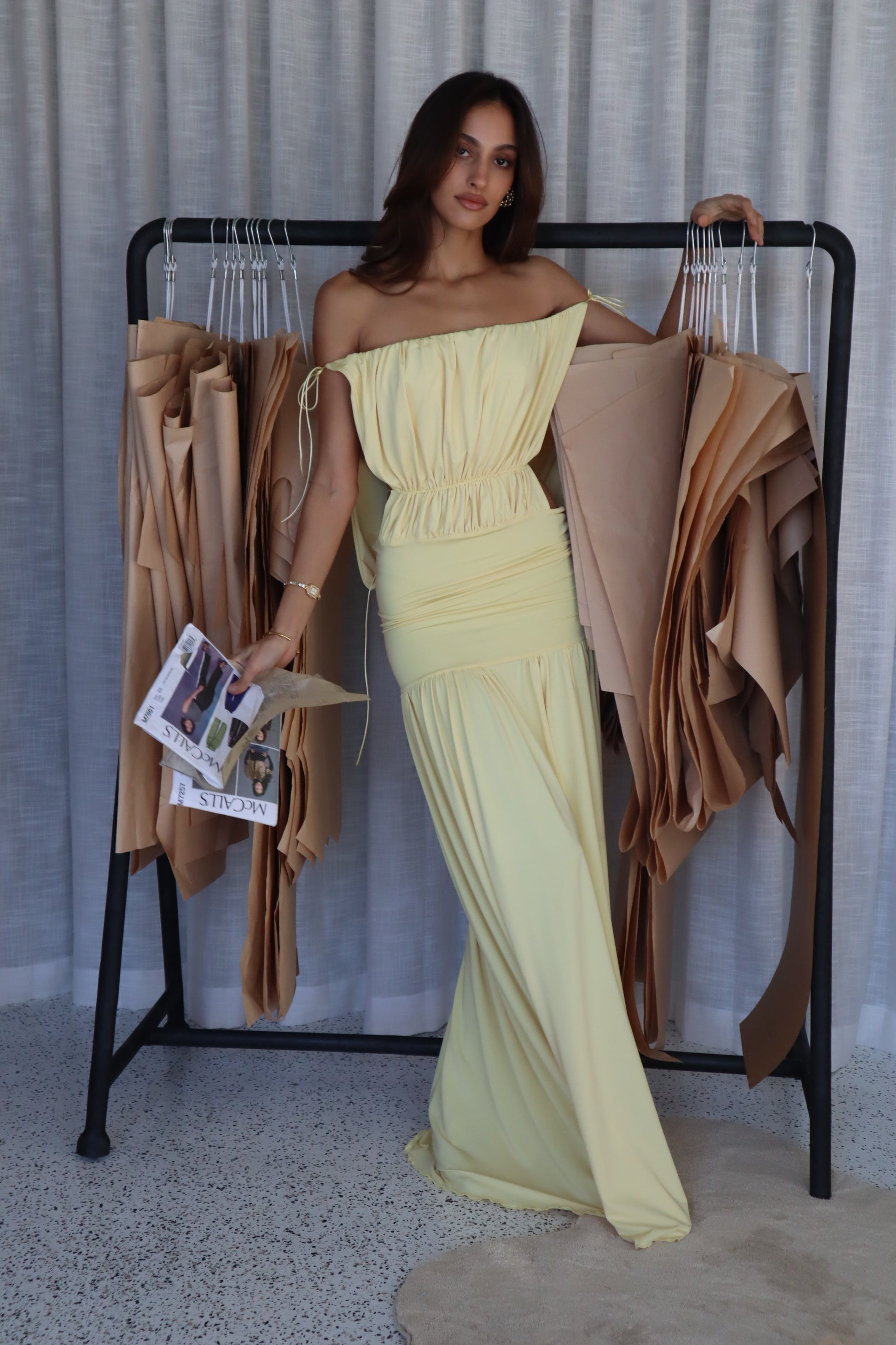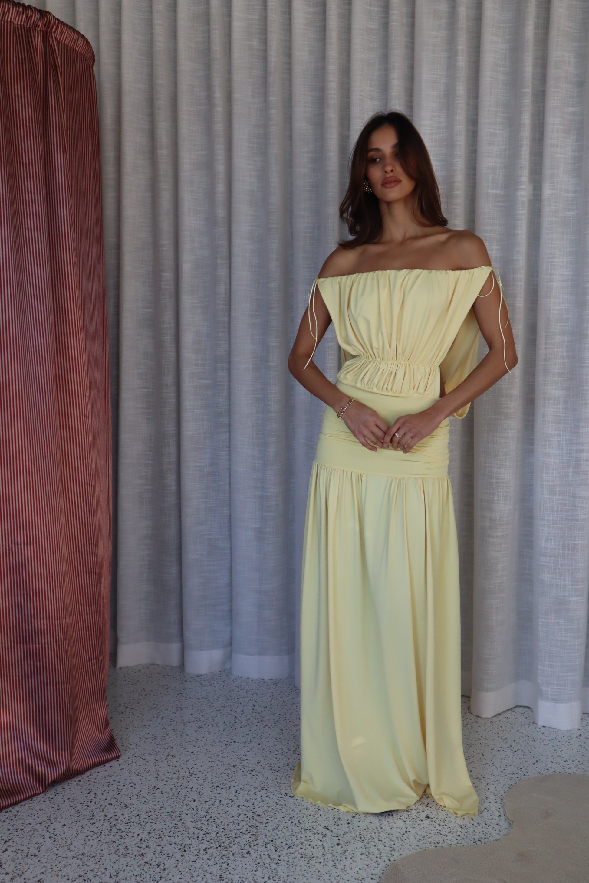 The skirt features a belted section, allowing you to adjust and distribute the fabric to your liking, flowing into a graceful draped hemline that makes this piece perfect for any summer formal event.